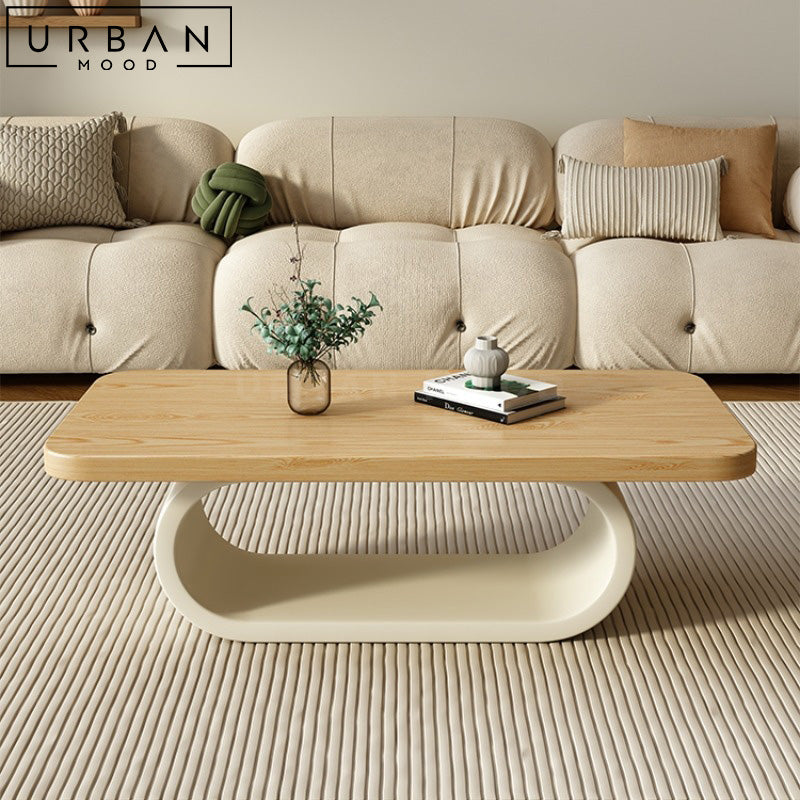 Crafted from pine wood, our VENTU coffee table is a stunning design featuring a pone wood table top with rounded corners, its warm oak hue adding an inviting touch of nature to your living space. Balanced upon an off white base that doubles as an open shelf, the neutral palette of this center table will complement any Japandi, Scandinavian, or Hygge interiors.