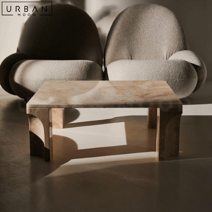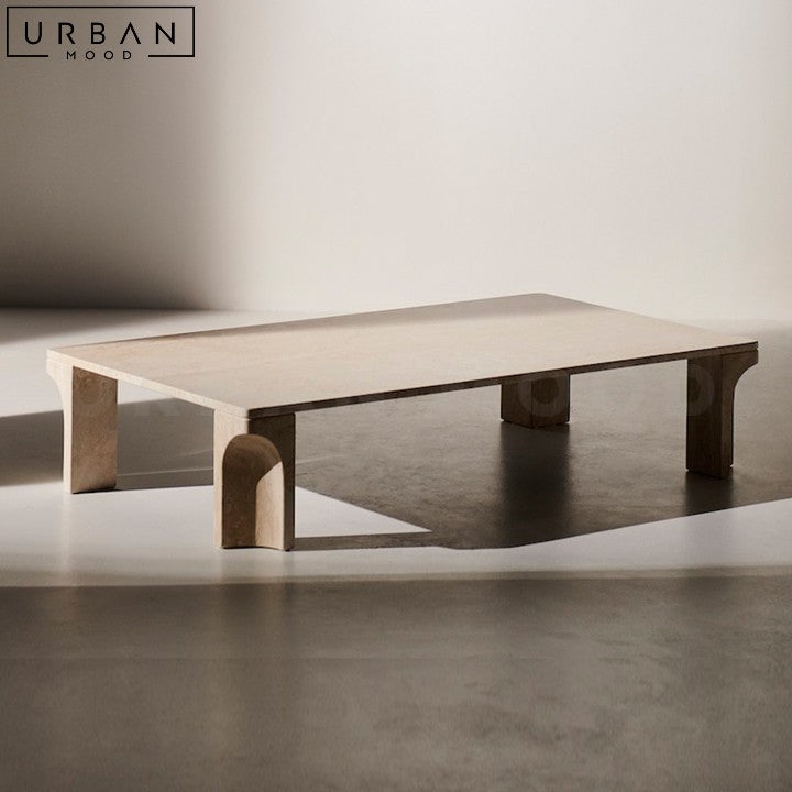 Infuse your living room with the spirit of wabi sabi design. Our stunning YEMI coffee table features a sleek and spacious travertine top supported by four sturdy travertine legs. The wide surface area provides ample space for decorative items, coffee table books, and conversation-starting centerpieces. The natural travertine stone adds a touch of elegance and sophistication, while its unique veining patterns bring a sense of organic beauty. Perfect for modern interiors, this coffee table combines functionality and style, creating a focal point in any Hygge or Japandi room. Its sleek design and natural charm make it a must-have for those seeking a statement piece that exudes refinement and poise.