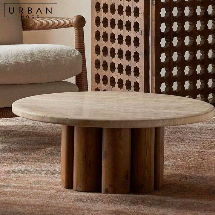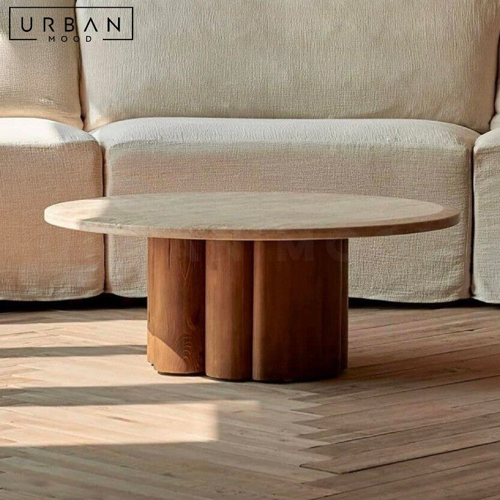 Enhance your living space with the ZAGA Modern Travertine Round Coffee Table. This elegant table features a smooth, natural travertine top and a solid oak wood base, combining durability with a contemporary design.