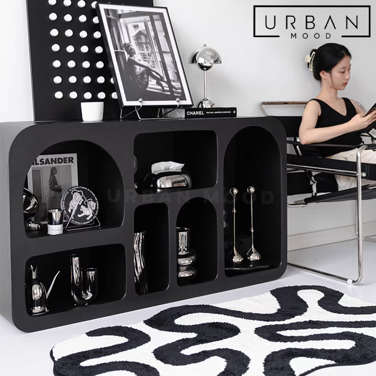 Featuring an eclectic mixture of irregularly shaped shelving, our BROMHAM display shelf is an anchor piece in any living room or office. Beveled edges and arched recesses add a touch of softness to your home structure. The matte black finish of the shelf will make a striking contrast in any minimalist, contemporary or eclectic setting.