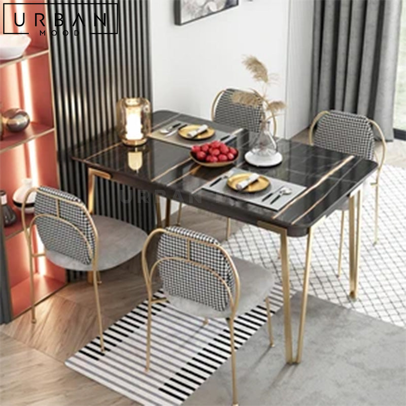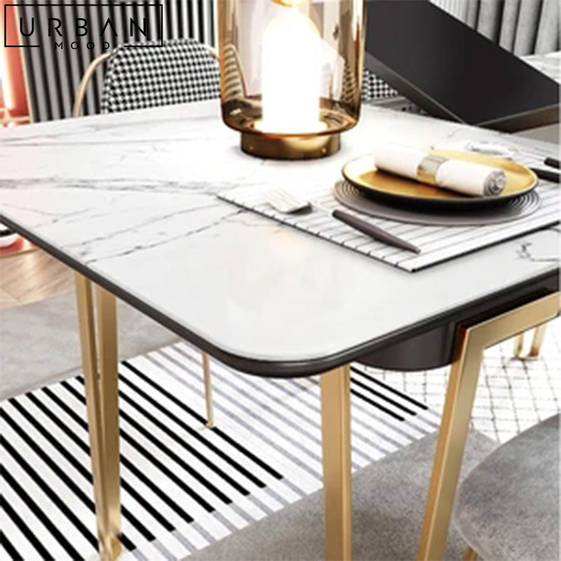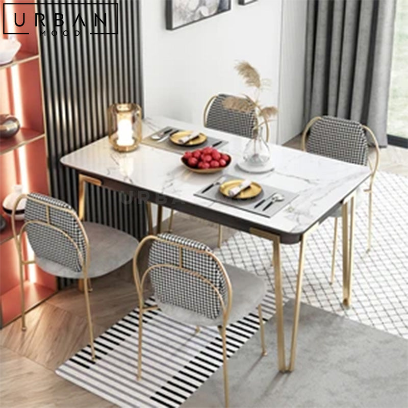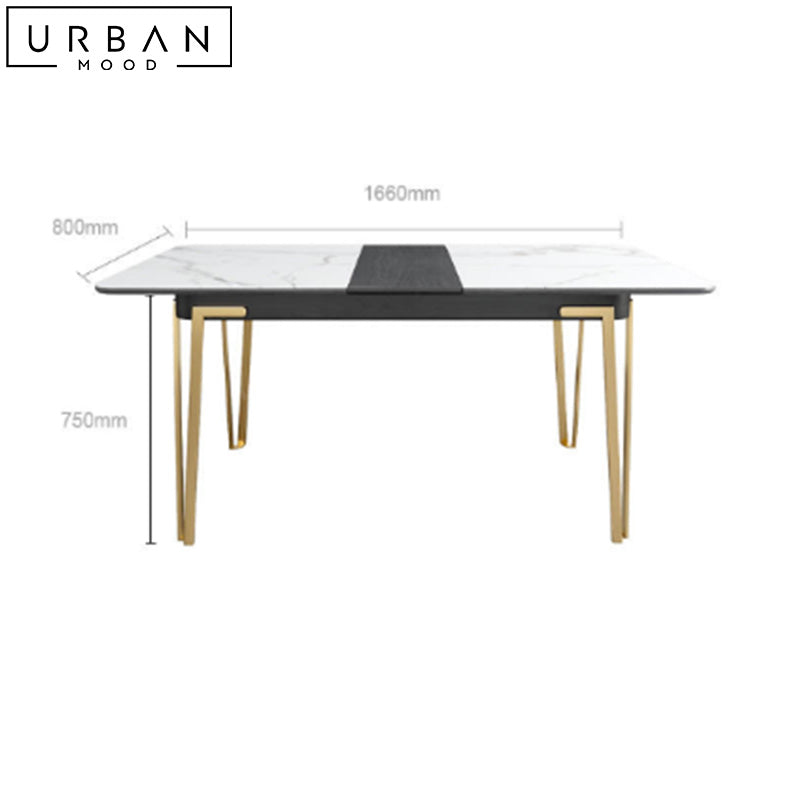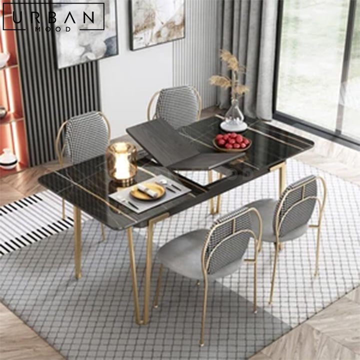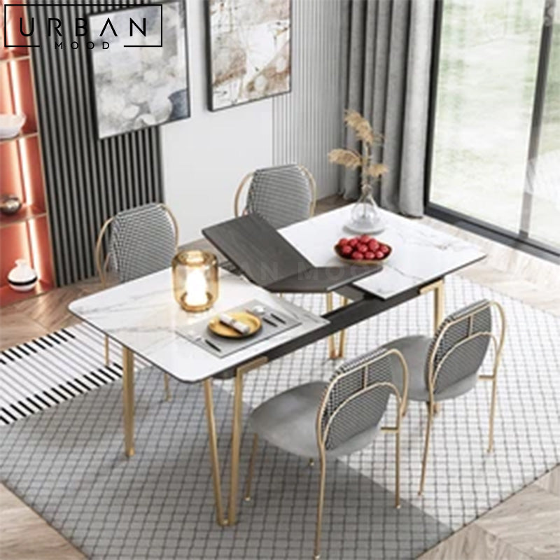 Featuring an elegant sintered stone top in marble print, out DENIS dining table combines style with durability, making it perfect for both everyday meals and special occasions. Supported by sleek hairpin metal legs, this table comes complete with an extendable feature that allows you to accommodate guests with ease, making it a versatile addition to your dining space. Its premium materials and intricate workmanship ensures this table will stand the test of time, whether in style or function.