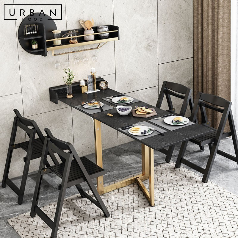 Designed with compact spaces in mind, our CELAN dining table features a wooden table top balanced on sleek metal legs in a contrasting gold tone. Cladded in an oak wood veneer, its natural wood grains and texture invite nature into your home. This table can be folded and stowed away when not in use, or extended to accommodate two or four guests. Choose from three different wood finishes to complement your modern, mid-century, or contemporary dining space.