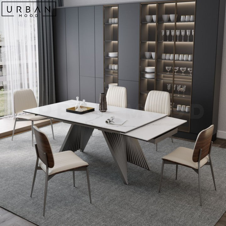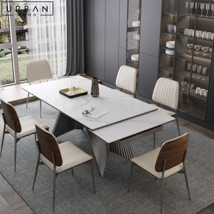 Crafted from highly durable sintered stone, our JILLS dining table showcases a stunning work of art for its base which is sure to command attention. Its modern style adds a sleek touch to any dining space, creating an ambiance of refined elegance. With a butterfly extension that allows the table to be unfurled to accommodate more guests during large gatherings, this table caters to all occasions. Renowned for its water, heat, and stain resistant properties, the sintered stone top ensures longevity and easy maintenance, while its timeless design makes it an ideal centerpiece for both casual meals and formal gatherings in modern, minimalist, or contemporary spaces.