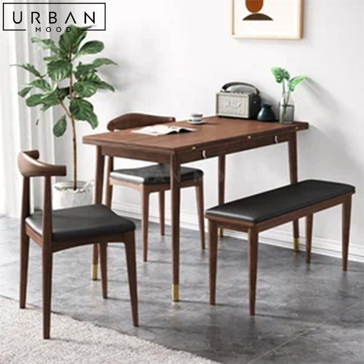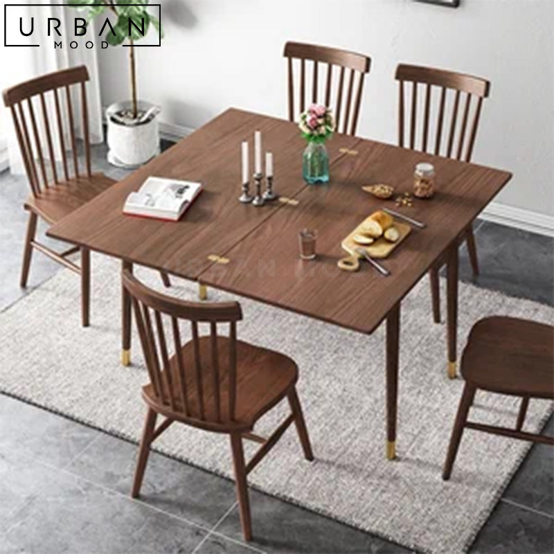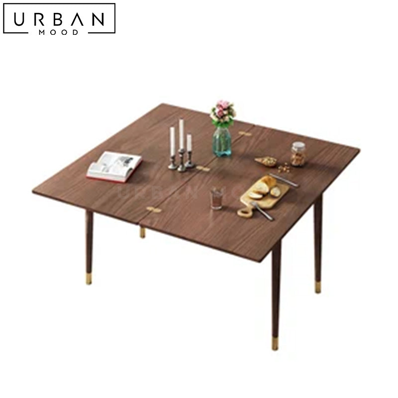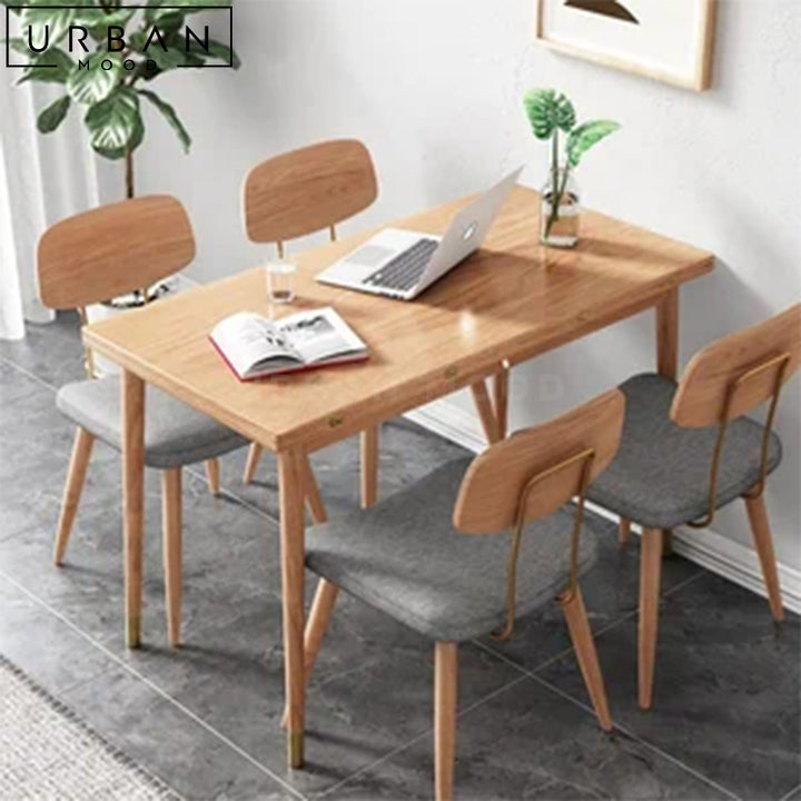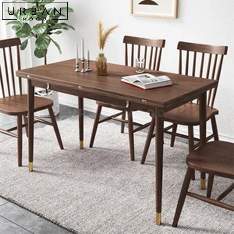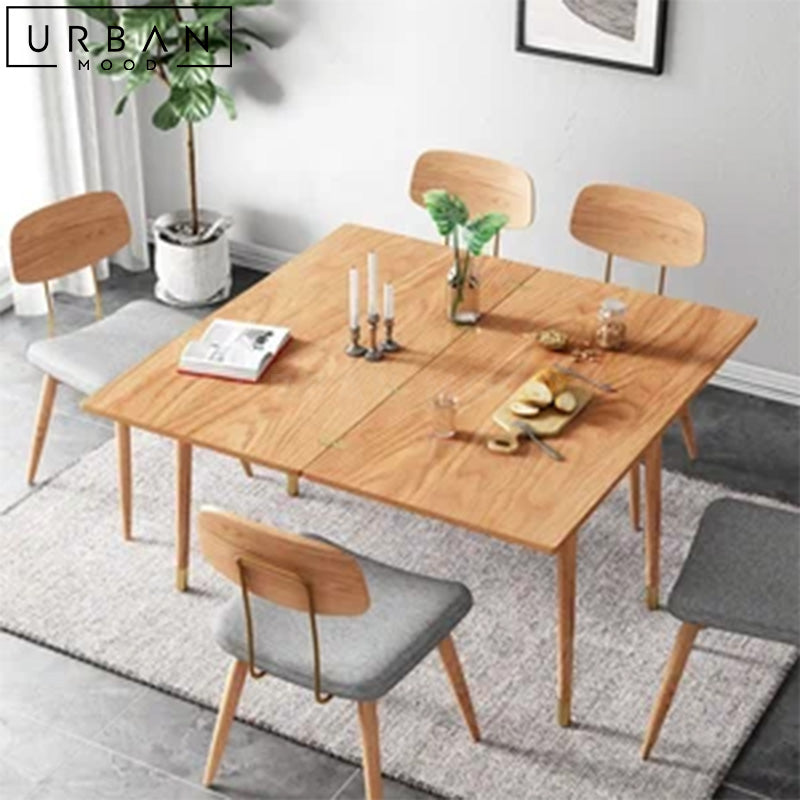 Crafted with an exquisite oak wood table top, OUR LOIC dining table exudes warmth and elegance with its unique butterfly leaf extension feature, allowing you to effortlessly expand the table for larger gatherings, making it perfect for hosting friends and family. The tapered oak legs are finished with luxurious gold tips, adding a touch of sophistication to your dining space. This compact yet spacious table accommodates guests for every occasion, and complements modern, rustic, and Japandi interiors.