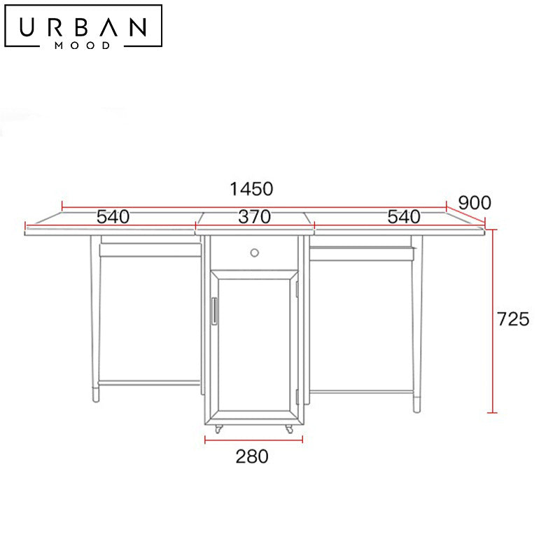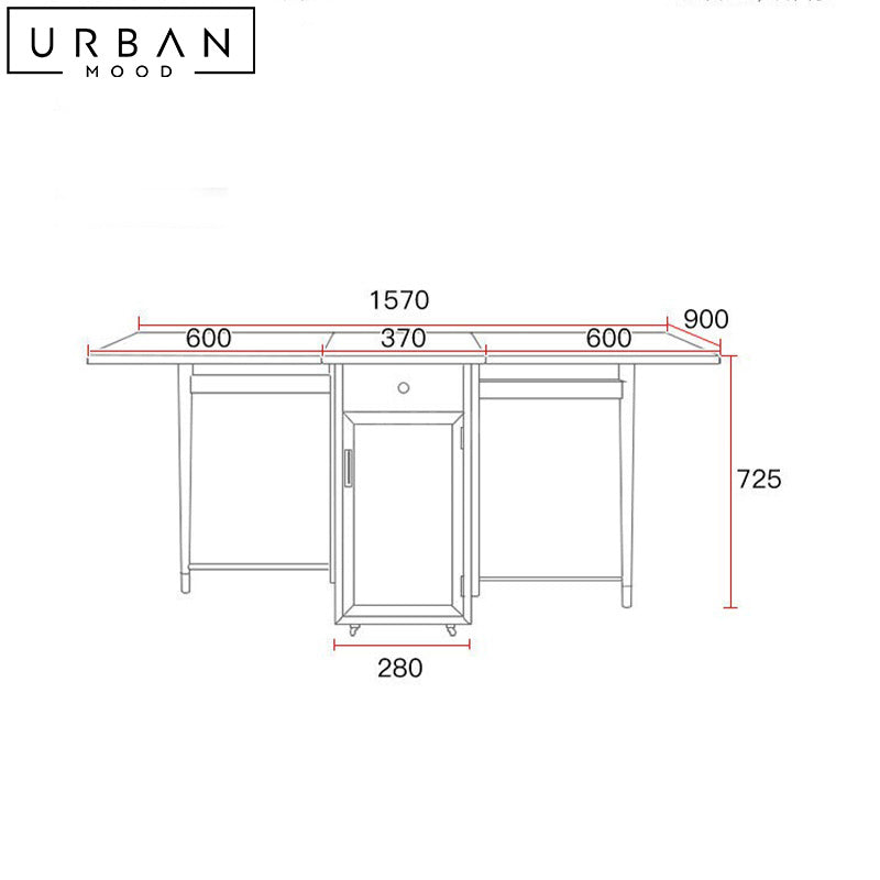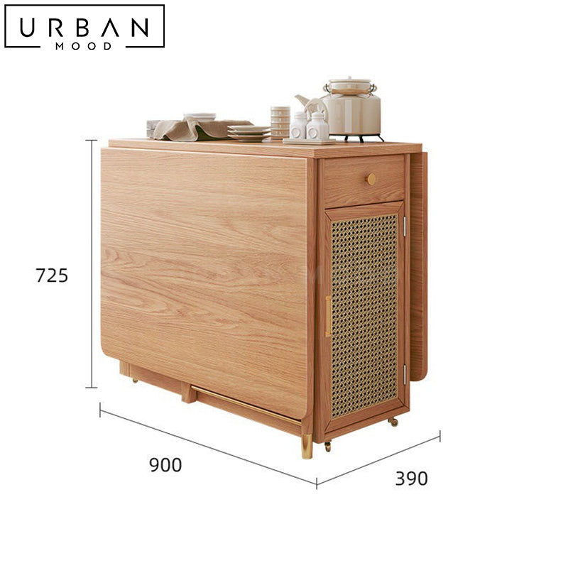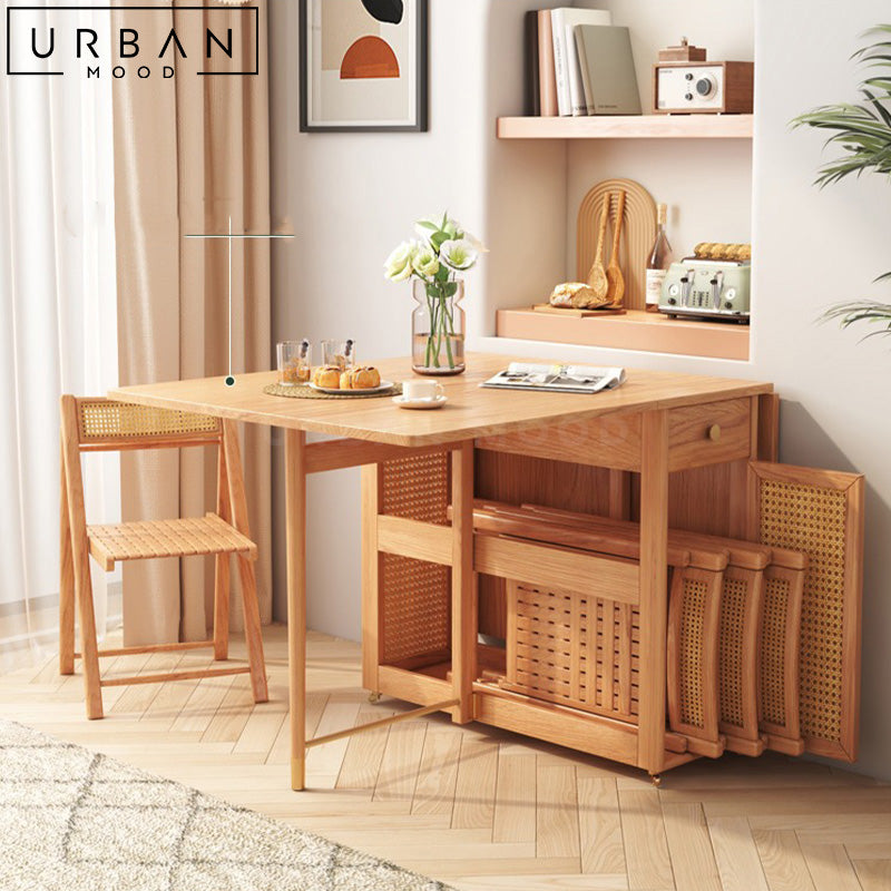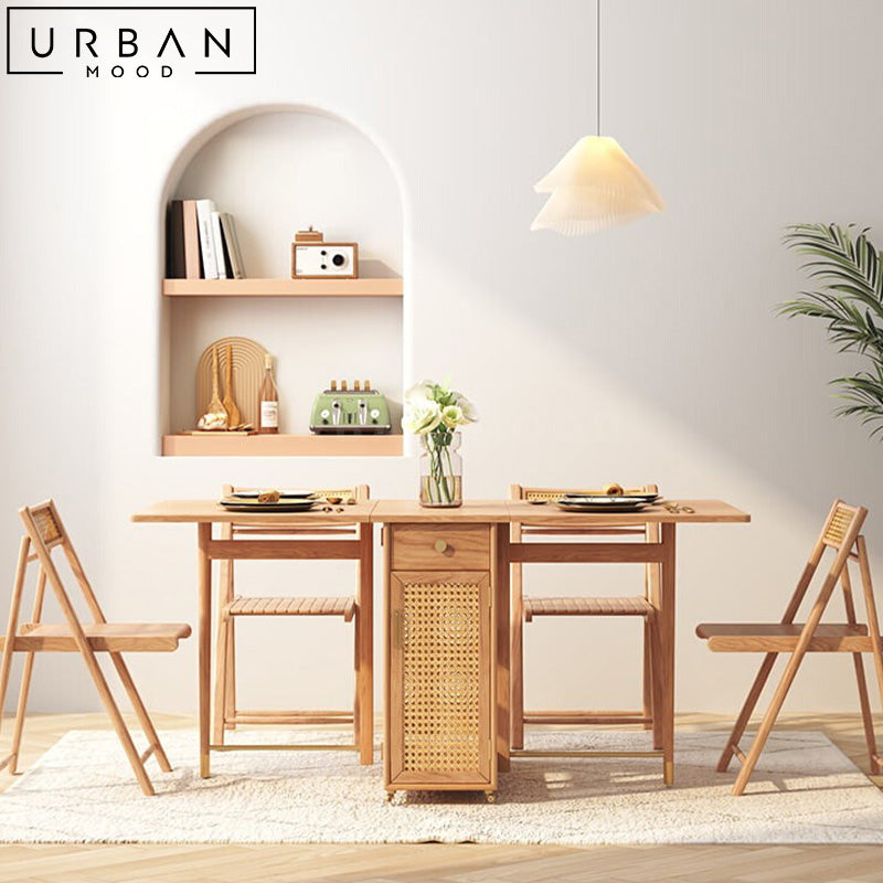 Explore the versatility of our PULATY Japandi dining table, designed with compact spaces in mind. This table's elegant fusion of wood and Japandi style complements Japandi, Rustic, Farmhouse and Retro inspired dining spaces. Featuring an extendable table top with an integrated cabinet base to stow chairs away, this table offers a sophisticated and charming centerpiece for your modern interior.