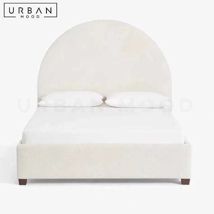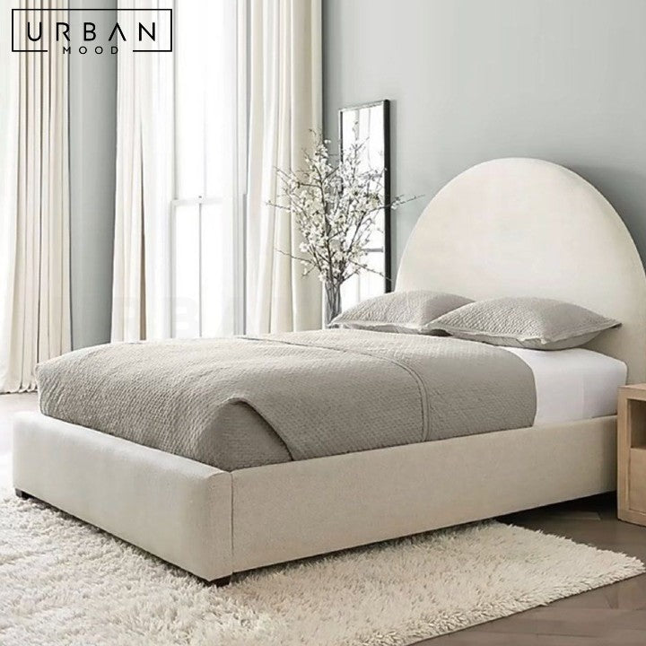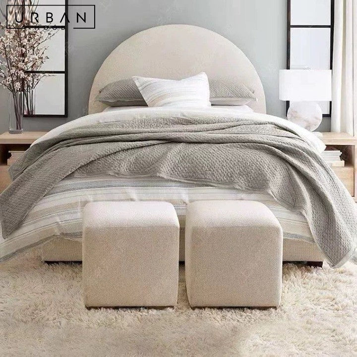 Bring serenity to your bedroom with our VANYA bed frame, featuring a tall half-moon headboard. Crafted with a solid pine wood structure, this simple yet elegant bed frame is upholstered in luxurious fabric, complementing Classic and farmhouse decor. Complete the cozy look with our OTHELLO ottoman.
