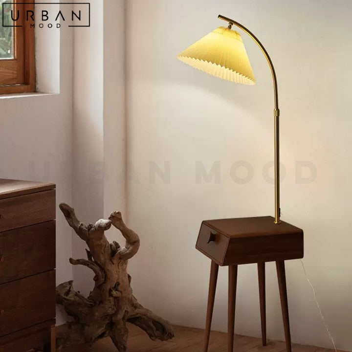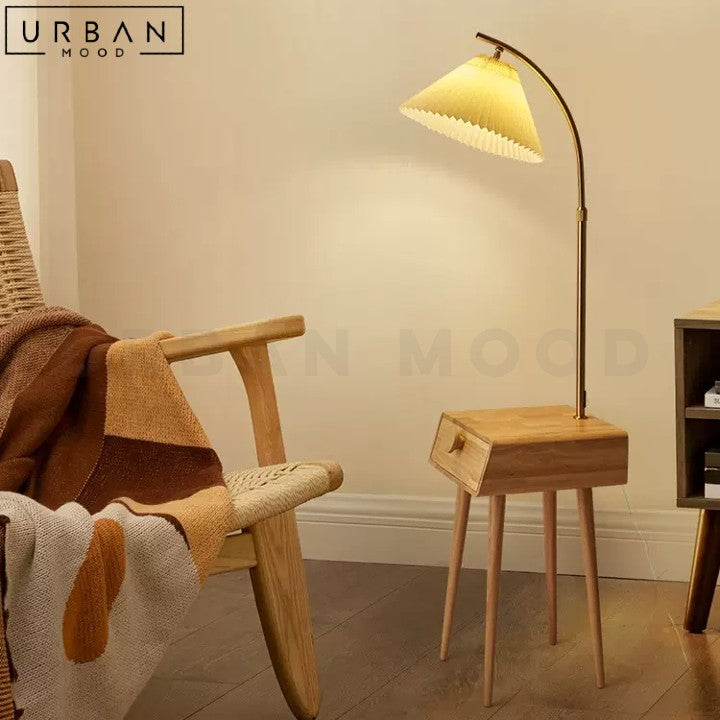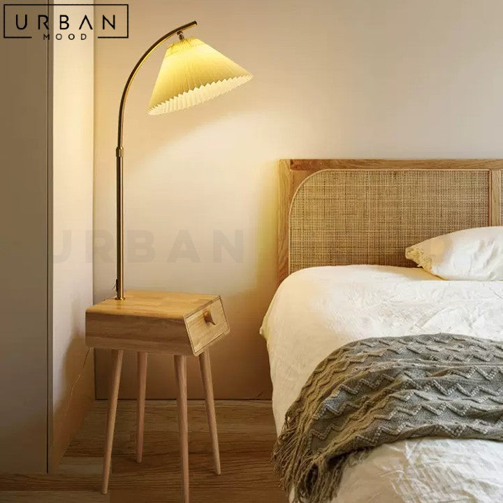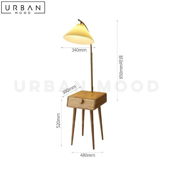 Bring warmth and functionality to your space with our Japandi-style BRANOV side table. Crafted from solid pine wood, this unique piece features a drawer for storage and an integrated floor lamp that provides soft, ambient light. The oak or dark walnut finish adds a touch of sophistication, while the space-saving design makes it perfect for small rooms or apartments. With its minimalist aesthetic and clever design, this bedside table is a standout piece that combines style, functionality, and convenience. Add a touch of Japandi chic to your living room or bedroom with this versatile and stylish piece.