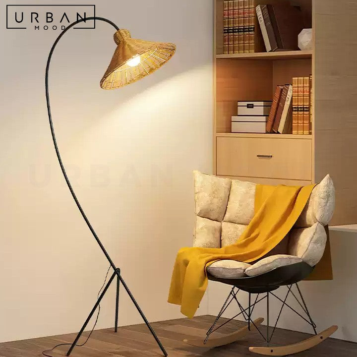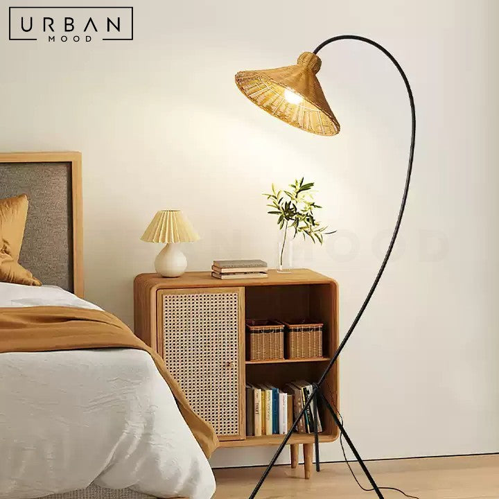 Add a touch of bohemian charm to your home with our MAYRA rattan standing lamp. Featuring a curved stand, this eclectic lamp brings a sense of organic elegance to any room. Perfect for creating a cozy reading nook or adding ambiance to your lounge, this lamp's natural rattan material and soft glow will transport you to a tropical oasis. A stylish and functional addition to any rustic, vintage, or retro room's decor.