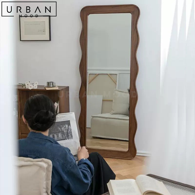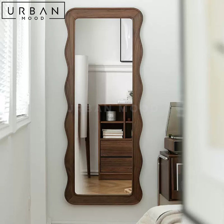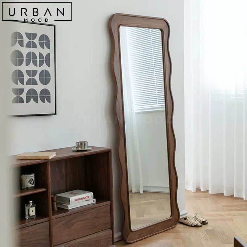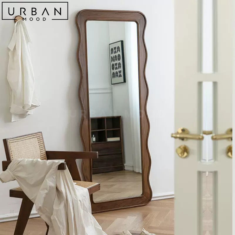 Encased in a thick wooden frame, our ROWE wall mirror is a statement piece featuring a water droplet silhouette framed in a thick walnut border. Its unique design makes it a versatile addition as a bathroom mirror or an accent mirror in your hallway, living room, bedroom, or office. Its shape and material bring a touch of nature into your home and makes it a focal point in any room. This mirror will reflect your style and enlarge your space in any modern, eclectic, or contemporary interior settings.