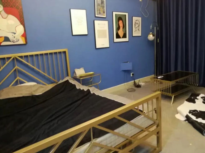 The Silvia satin gold bedframe comes with a mid century appeal with its intricate details on a tall headboard. Crafted fully from electroplated metal, the headboard features a mix of vertical and slanted lines for a modern and contemporary touch. Fits most standard size mattresses.