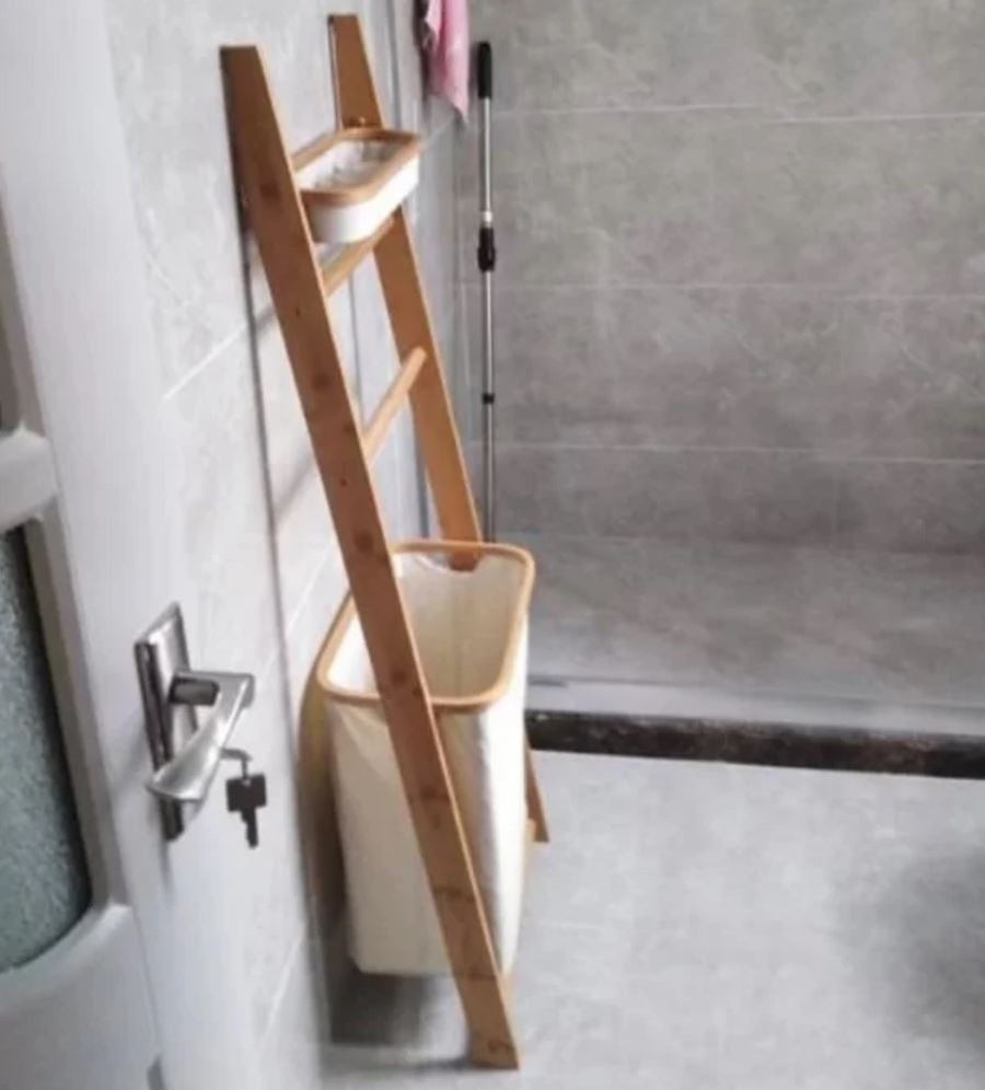 A unique and multifunctional rustic ladder display stand that doubles as a bathroom or bedroom utility rack, the Walton design features the bright warm tones of natural oak, paired with soft creamy wateproof fabric bags for your laundry, bottles, and essentials.