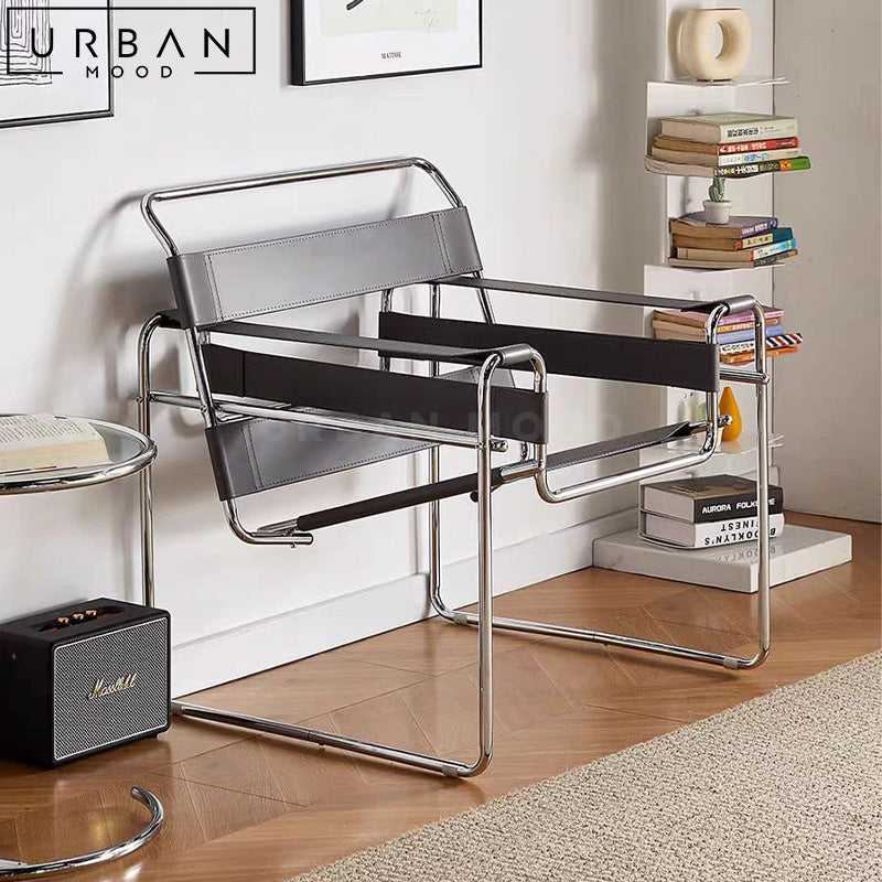 Get comfortable for long hours at your desk with our DOLOS armchair, featuring a boxy silhouette framed by stainless steel and leather panels for both backrest and seat. This versatile design is suitable for both work and leisure settings, and works well as a reading or lounge chair. Choose from a selection of sophisticated colours to complement your modern, minimalist, or classic home office.