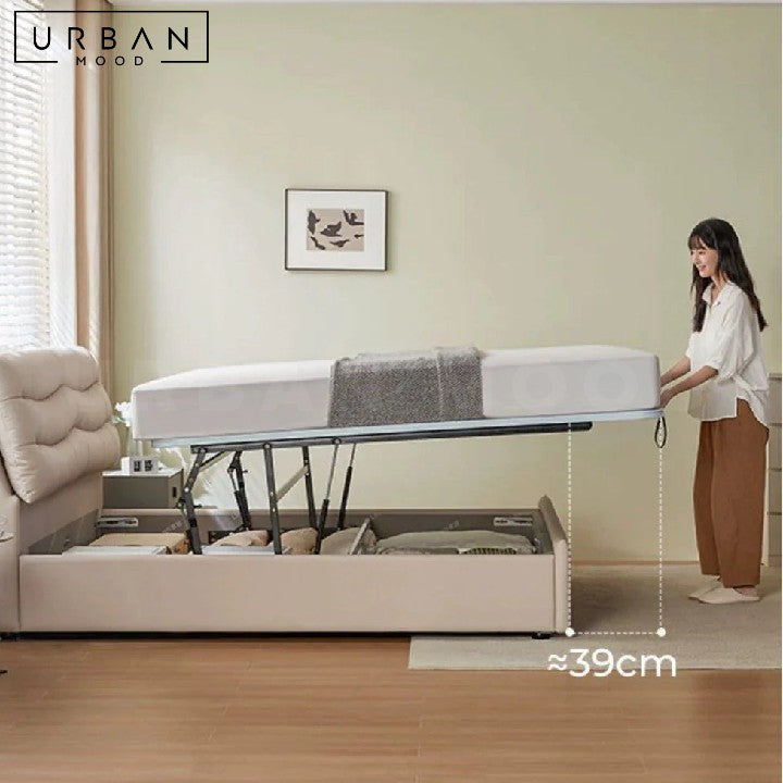 Constructed with a sturdy pine wood internal structure and topped with premium top-grain cowhide leather, our CHEER bedframe offers ample storage space. The hydraulic system allows for easy lifting, revealing spacious drawers along the bed's length. A plush cushioned headboard adds comfort and elegance. Perfect for modern bedrooms, this leather storage bedframe provides a comfortable and organized sleeping space.
