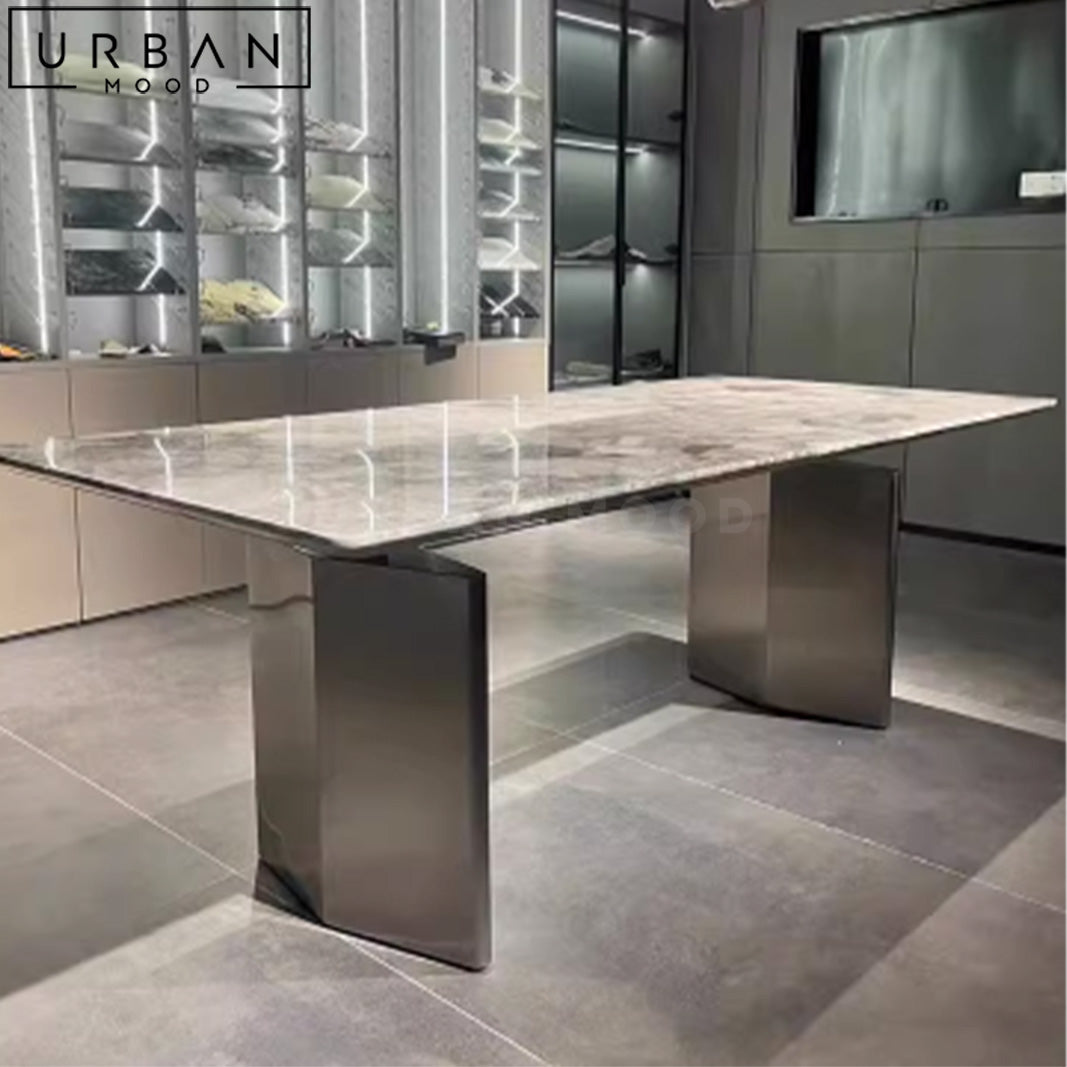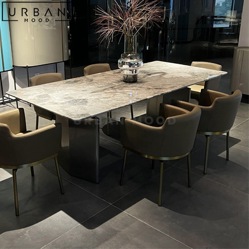Featuring a grandiose marble top supported by stainless steel legs in a titanium finish, our LUTTON dining table adds a touch of luxury to your dining experience. The marriage of marble in a high gloss finish and the durability of stainless steel ensures lasting beauty and functionality. This dining table reflects your taste and appreciation for classic elegance, and draws attention to it with its extravagance. Complete the contemporary look with our ISLE leather dining chairs.