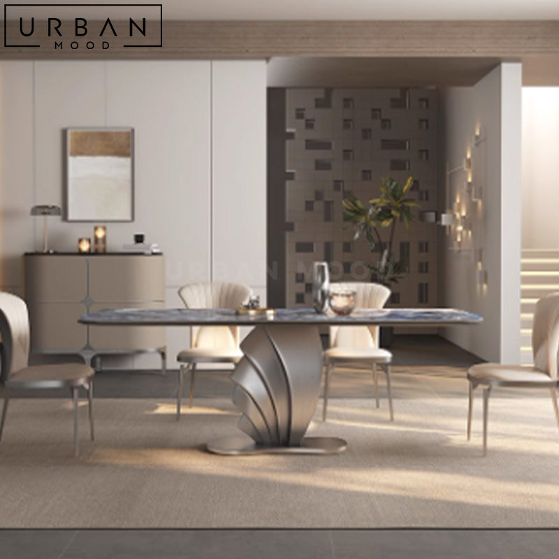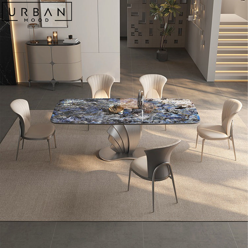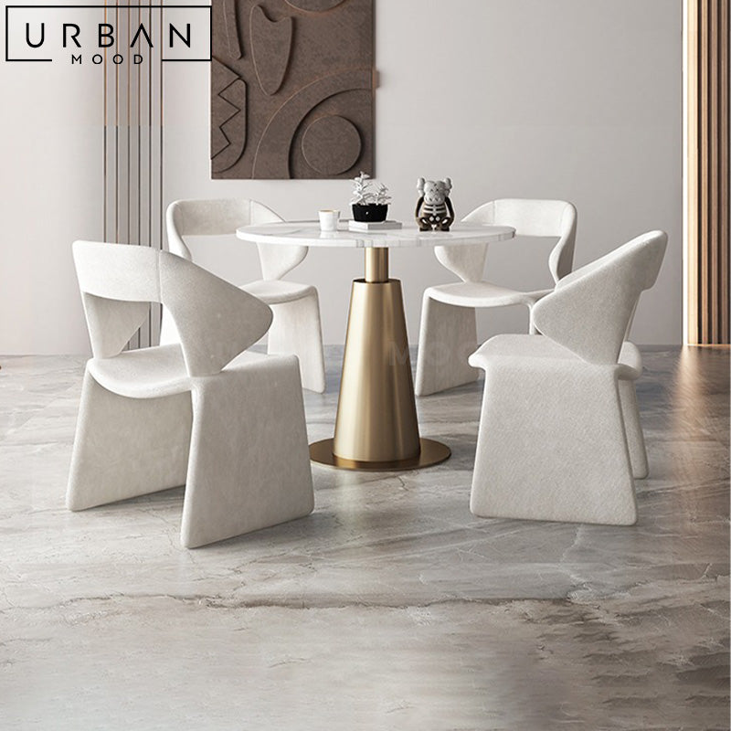 The perfect contemporary addition to any dining space, our MBAEL table is crafted from engineered marble and showcases a stainless steel column leg in brushed gold. The velvet upholstered chairs, with their eclectic design, add an artistic flair and is a great way to make a statement in your living room, dining room or any other space. Its premium materials and workmanship ensures this timeless design will last for years to come. A great way to complete your modern, minimalist, or Victorian home.