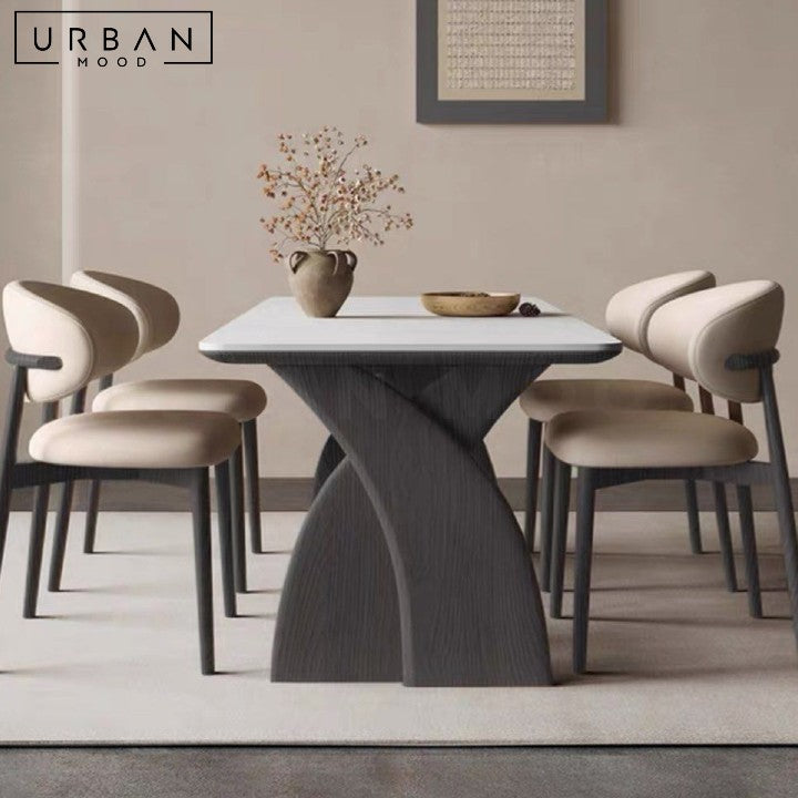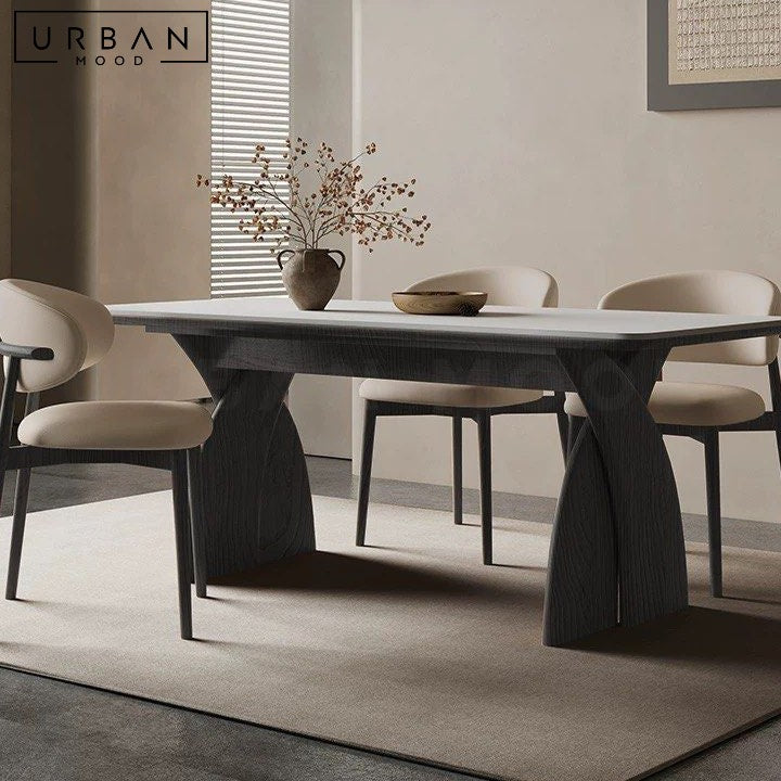Our PAWS dining table is a luxurious and timeless design featuring sturdy ash wood legs in black or walnut and a sintered stone top. This table boasts a slightly rounded top for child-friendly safety. Perfect for busy families, the sintered stone surface resists scratches, stains, and heat. Enjoy effortless entertaining with this low-maintenance, high-style piece. Ideal for family dining, modern interiors, and effortless entertaining.