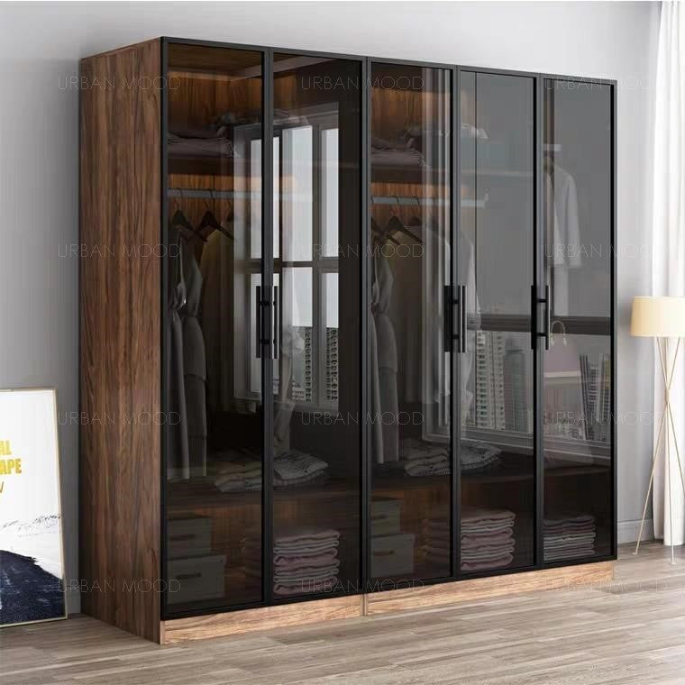 The Dallas wardrobe design showcases beautiful black tinted casement doors framed by a rich walnut veneer, and warm backlight to provide visibility even at night. Each cabinet comes with three tiers, an overhead shelf for bags and boxes, a main body for hanging clothes, and a bottom tier for cushions and linen. Choose from two to six door arrangements to suit your walk-in wardrobe space.
