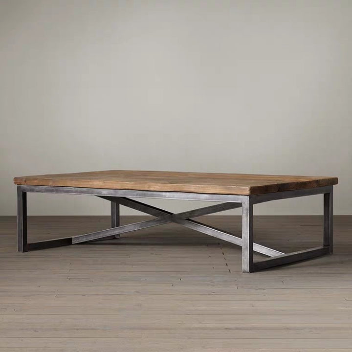 A distinctive brushed silver steel framework with crossbeams supports a reclaimed pine wood surface, adding a rugged and distressed look to the design. This rustic piece is versatile in its placement as a slim communal dining table, hallway console, tv console, coffee table, or side table.