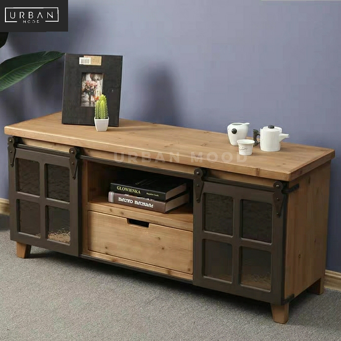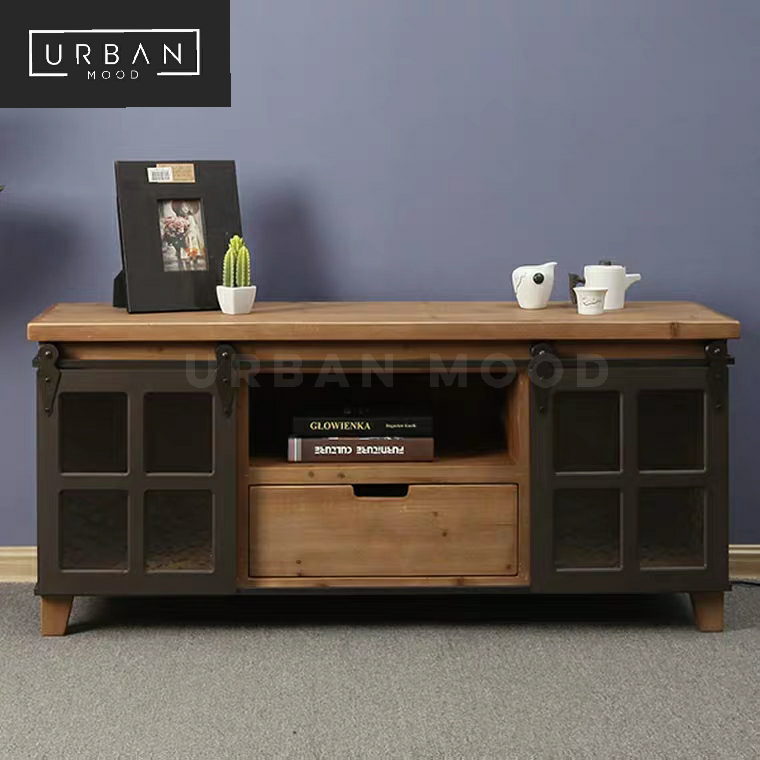 Take your industrial game to the next level with this modern mid-century inspired TV stand design. Built with high quality manufactured wood and sleek matte black metal sliding doors for an old factory appearance, this entertainment unit provides an open shelving for your media box, pullout drawer for your cables and accessories, and two wide shelving units for additional storage. Use it as a TV console, storage cabinet in your closet or bedroom, or buffet in your dining area.