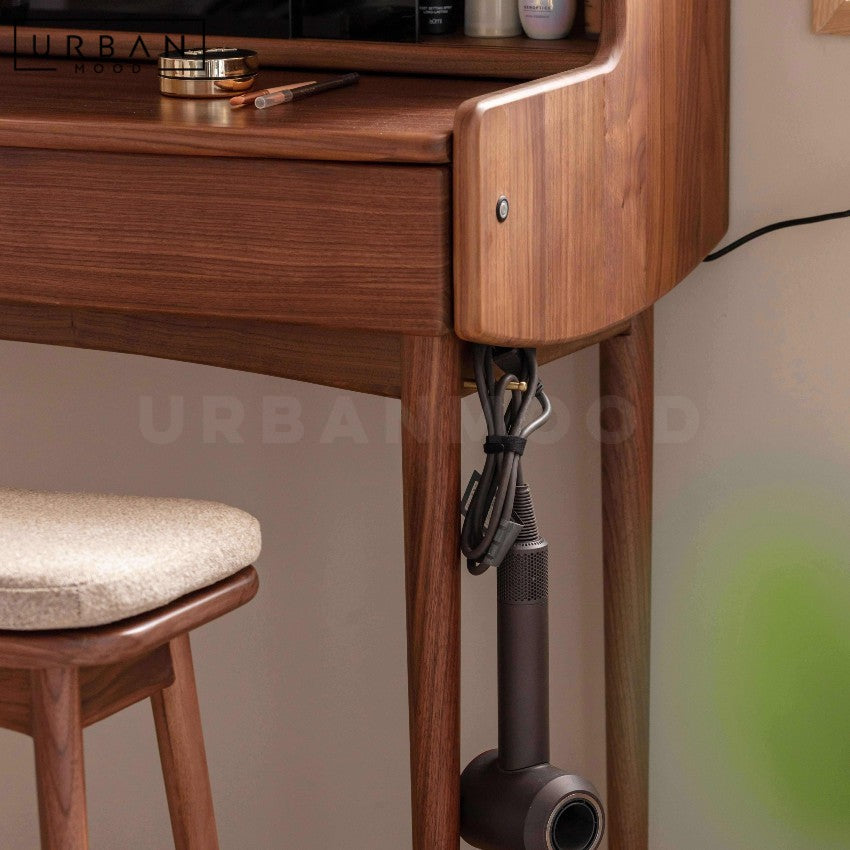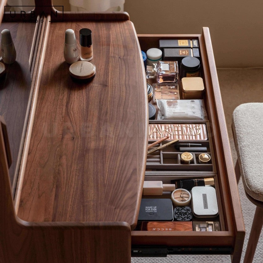 Built with care, our EDSON dressing table comes with an integrated sliding door cabinet for your make up and beauty products. Showcasing excellent craftsmanship and a clean, contemporary design, this make up desk is designed structured to provide a spacious surface for daily routines while maintaining a compact footprint, making it suitable for HDB and condo bedrooms or dressing areas. The rich walnut finish adds warmth and character to any rustic or vintage interior styles.