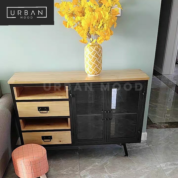 Define your living space with this masculine and durable buffet or sideboard. Crafted from solid pine wood and industrial steel, the cabinet features two open shelving units, two drawers, and two casement doors for kitchenware and wine glasses. The Hurley design adds a touch of natural warmth with its golden walnut tones and organic grains, ideal for industrial, rustic or cottage interior themes.