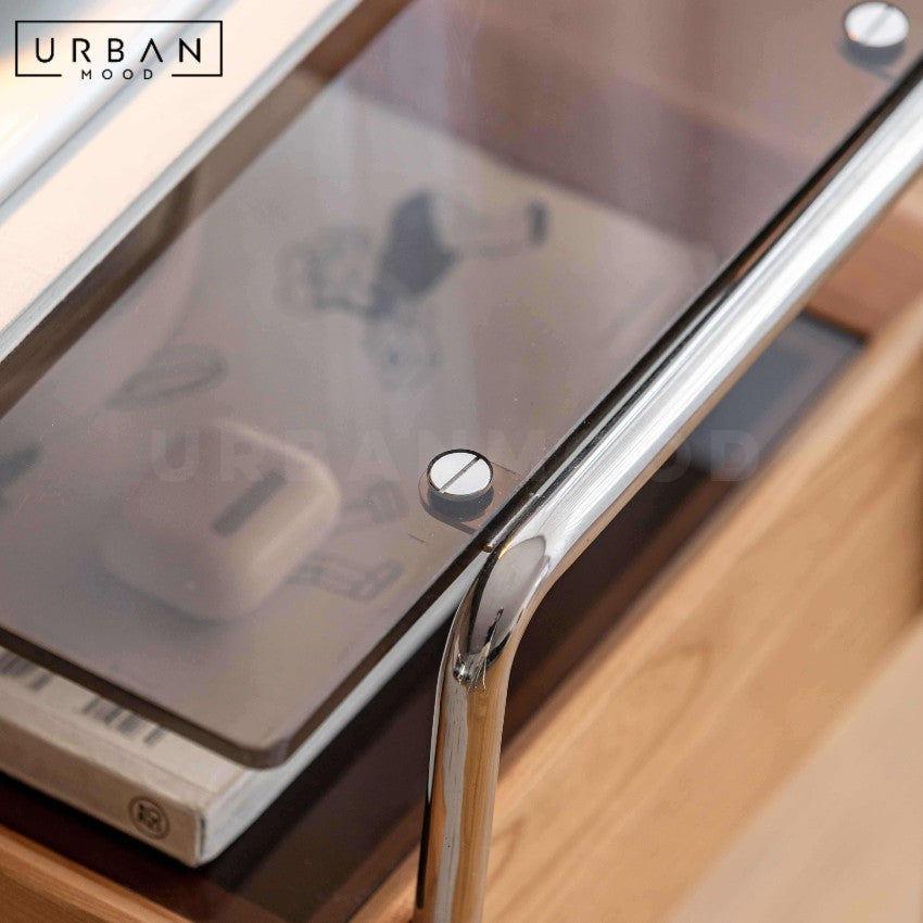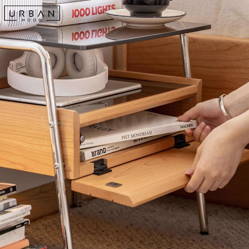 Built from durable cherry wood, the LILIES nightstand combines natural beauty with practical design. Its compact shape makes it easy to move, offering flexibility for Japandi, Muji, and Scandi bedrooms, guest rooms, or small living spaces. The smooth glass top adds a touch of refinement while providing a sturdy surface for lamps, books, or personal items.