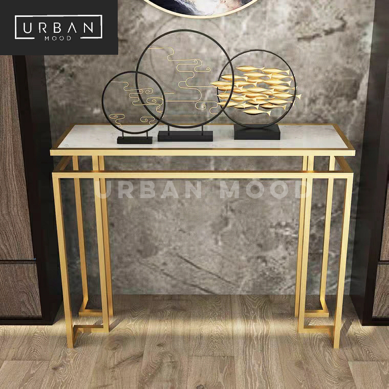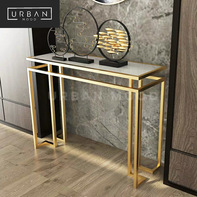 A streamlined and structured foyer table crafted from engineered marble top and framed with a double tier powdercoated satin gold metal framework, providing a levitating effect. This multifunctional hallway table will greet you and your guests with class and make a lasting first impression.