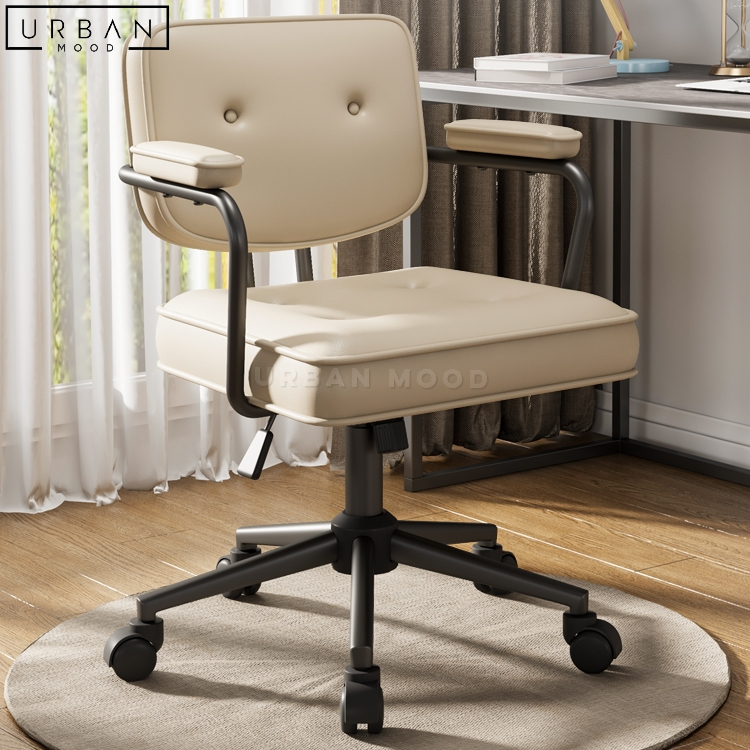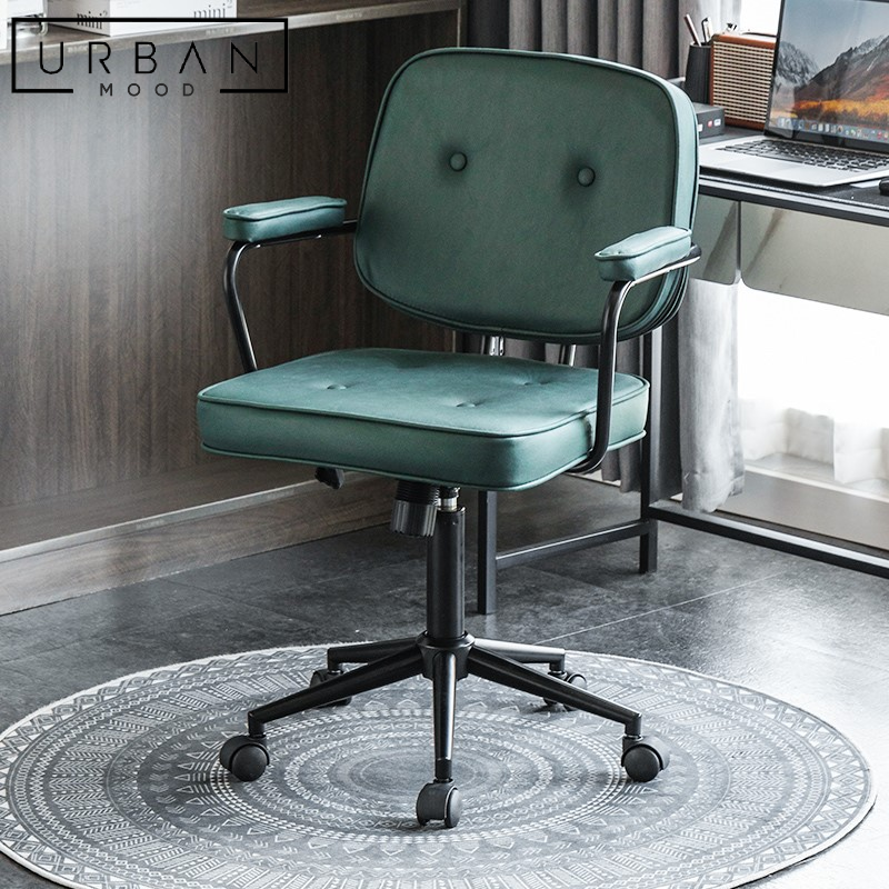 Get comfortable for long hours at your desk with our POLLEN swivel chair, featuring a boxy cushion and backrest with buttoned detailing and cushioned armrests. This versatile design is suitable for both work and leisure settings, and works well as a study or gaming chair. Choose from an array of bold colours to add a touch of eclecticism in your modern or classic home office.