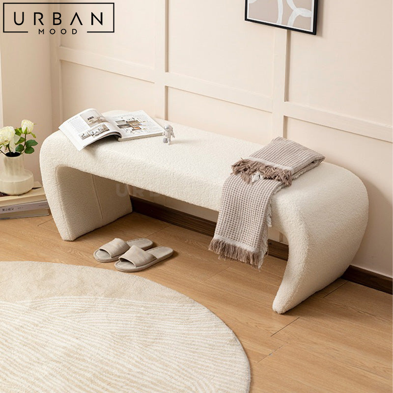 An understated yet sophisticated piece that adds a touch of luxury and comfort to your living space, our CELINE bench features elegantly curved ends, drawing attention to it whether placed at the foot of your bed, in your entryway, or as additional seating in your living room. Crafted entirely from luscious boucle fabric, it offers a soft and inviting seating experience. Its versatile design and neutral color make it suitable for various placements and interior themes, from minimalist to hygge or Japandi.