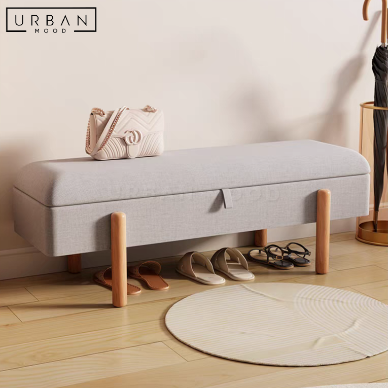 A multifunctional bench designed with a clean-lined structure, our HITO storage ottoman features pine wood legs that provide a natural aesthetic while ensuring easy access for a robot vacuum to glide under the raised trunk, keeping your space clean and tidy. With ample storage space concealed within, this ottoman combines practicality and elegance. Whether placed in the entryway, dining area, or bedroom, this storage ottoman provides both convenient storage solutions and a seating area for guests. Its neutral palette complements modern, Scandinavian, and Japandi interior settings.