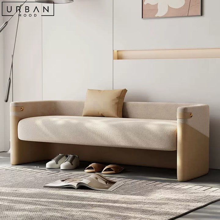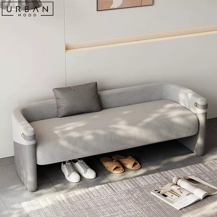 Discover the comfort and convenience of our MATILDE bench. Crafted from premium fabric, this modern ottoman features a sleek design and ergonomic backrest providing support while changing shoes. Perfect for entryways or closets, it offers a comfortable spot for quick changes. Elevate your daily routine with this multifunctional seating option, a practical and stylish addition to any modern home.