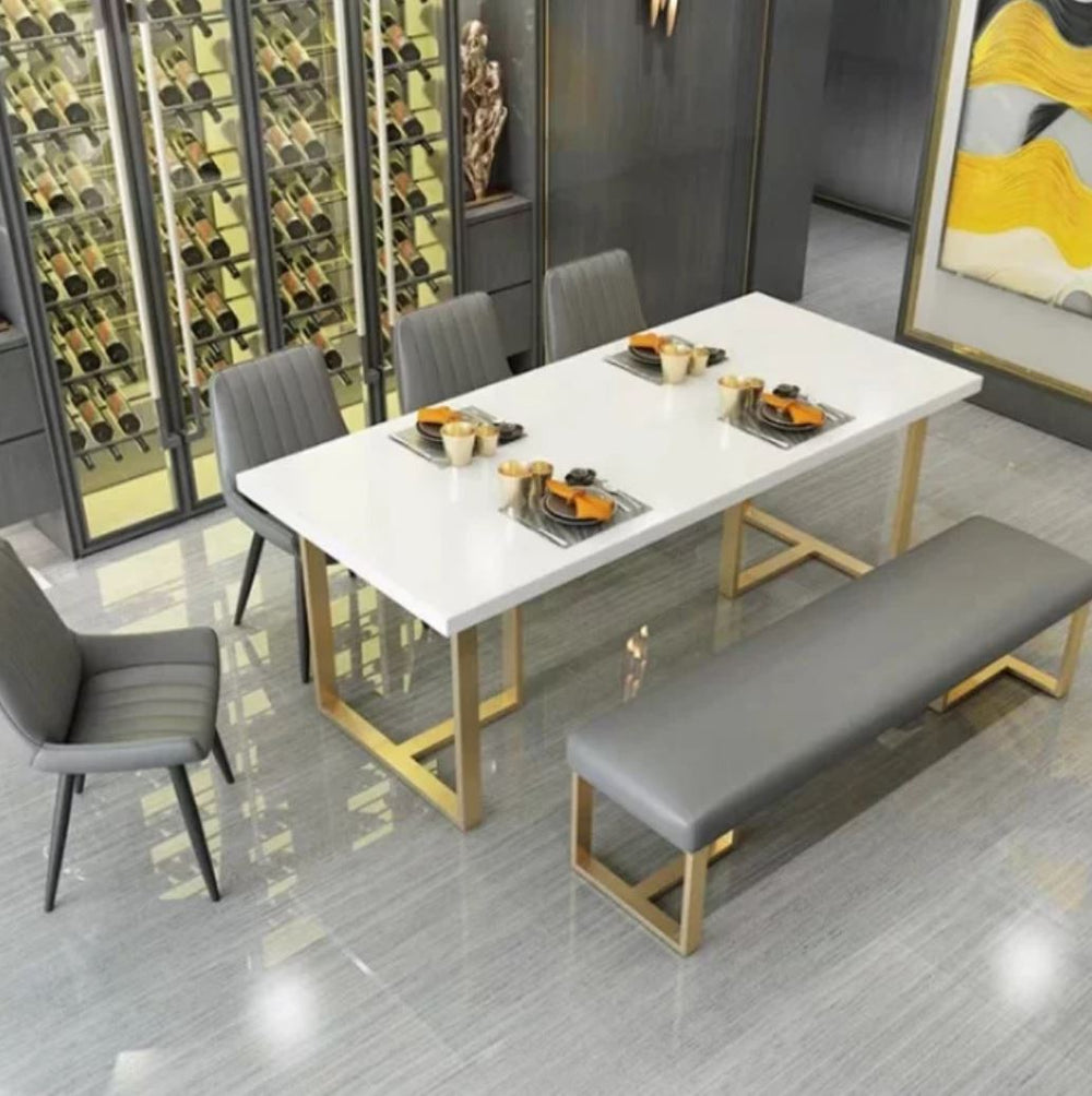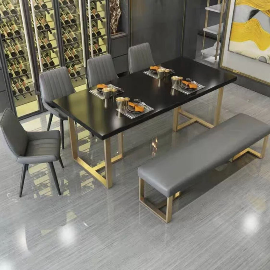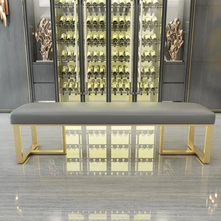 Classically designed with a contemporary twist, the Maya ottoman is versatile in its function as a dining bench, foyer seat, or as a bedroom bench at the foot of your King sized bed. Wrapped in luxurious PU leather with edgy powdercoated satin gold steel legs, the bench is a handsome addition to modern, classic, or mid-century styled homes.