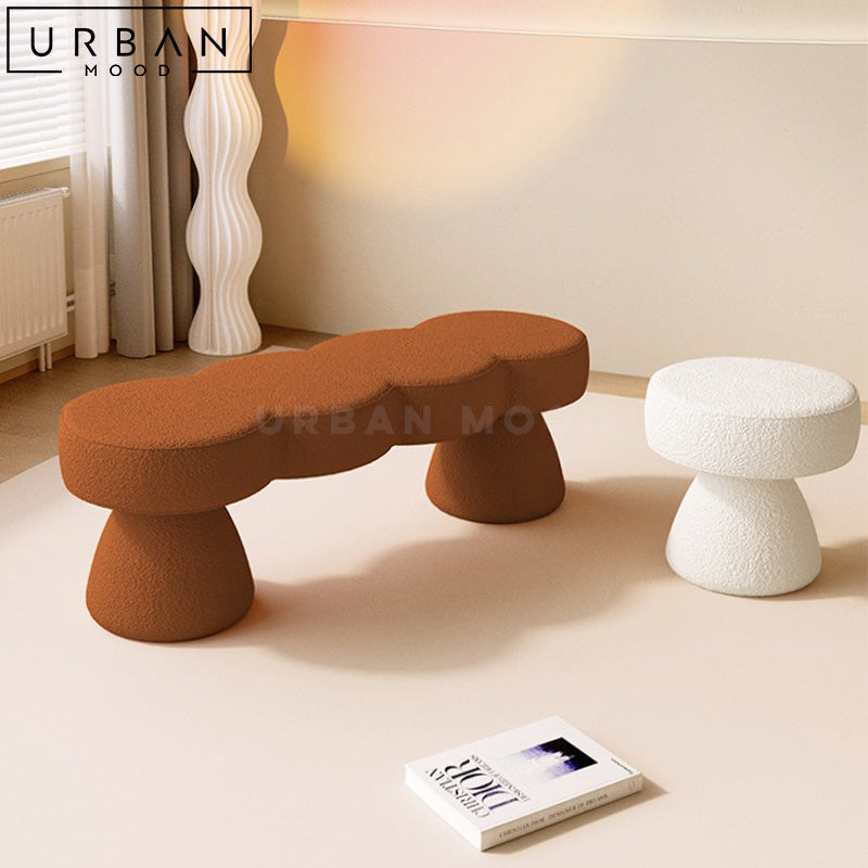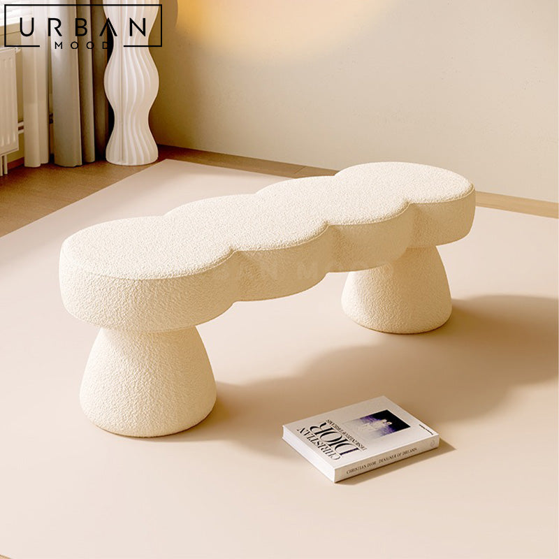 Enhance your living space with our SALVA boucle bench, a perfect blend of style and functionality. This bench features an eye-catching cloud-shaped pattern that complements various interior styles, from minimalist to Japandi. The sturdy internal wood structure ensures durability and stability, while the boucle upholstery adds a touch of comfort and elegance whether placed in your entryway, living room, or office lounge.