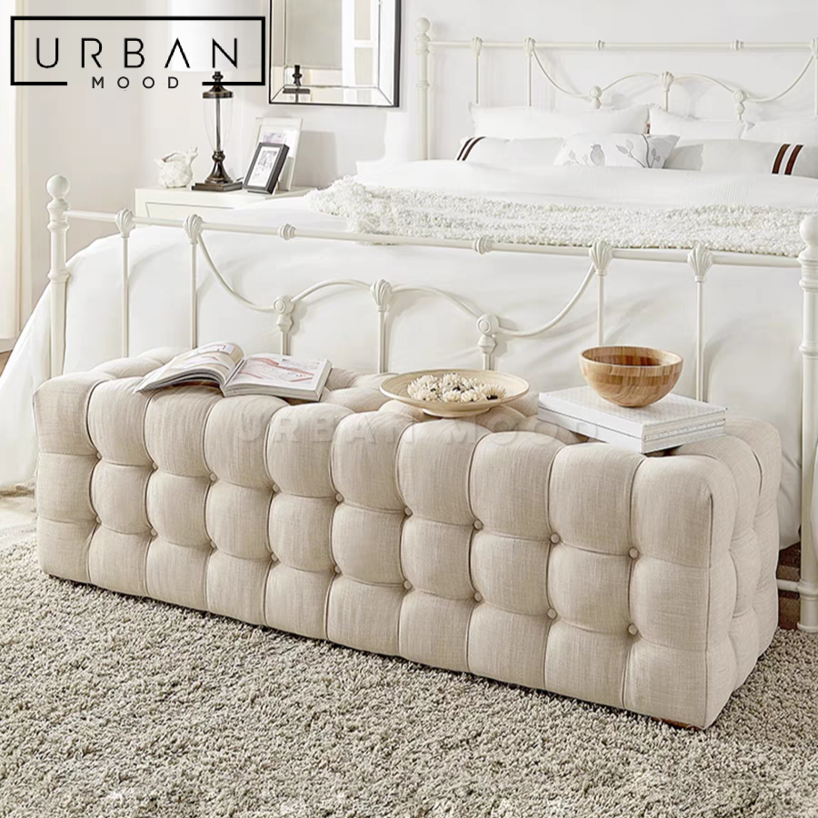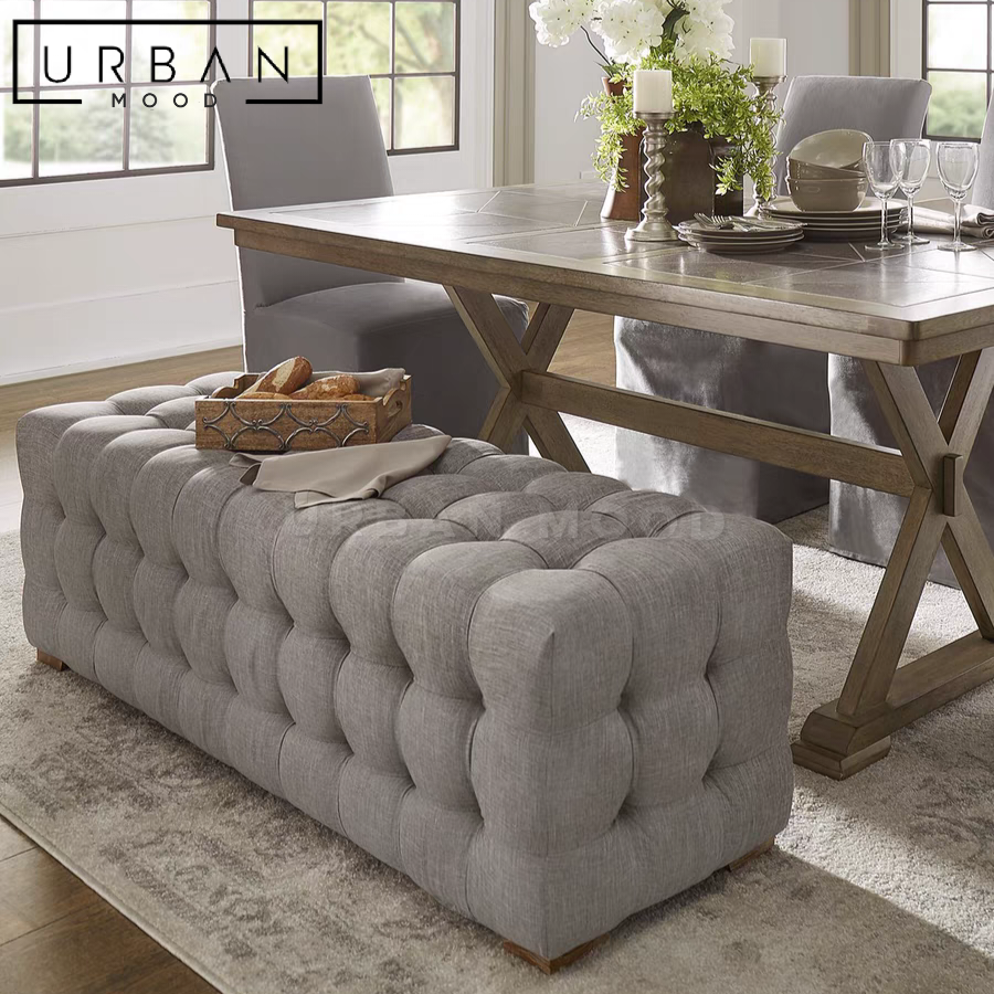 Style your hallway, living room, or bedroom with our TYRA ottoman. Boasting a sleek and refined structure, this ottoman exemplifies classic allure with contemporary flair. Upholstered in textured fabric, this ottoman exudes both comfort and longevity, providing a luxurious seating or footrest experience. The meticulously tufted design adds an air of lavishness, while the Victorian style imbues any living space with a sense of grandeur. Enhance your living room, bedroom, or office with this sophisticated accent piece.
