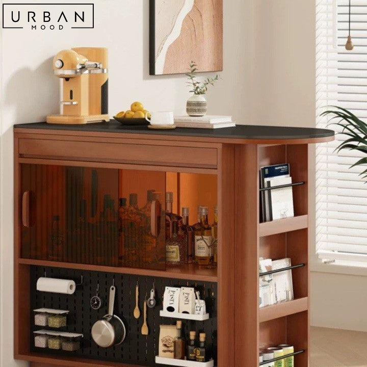 A stylish addition to any kitchen or open bar space, our MORRISON island table is crafted from high-quality ash wood, offering a durable and elegant bar counter for dining or casual gatherings. Its sintered stone table top ensures long-lasting durability, while open shelves and drawers provide ample storage capacity for your dining ware and leisure materials. This multifunctional island table is an all-encompassing solution for modern and industrial compact spaces.