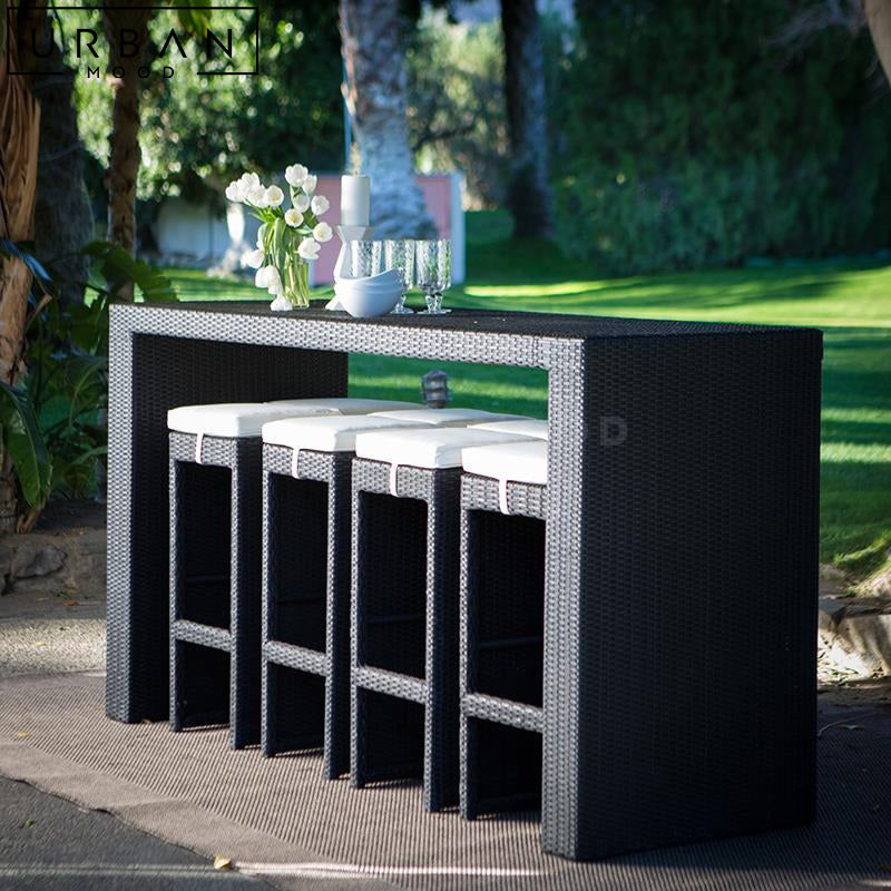 Crafted from water-resistant synthetic rattan, our SANRO outdoor dining set ensures long-lasting quality and resistance to the weather elements. The modern design of the table and chairs adds a touch of sophistication to any outdoor setting, while its compact chairs ensure you can tuck them under the table fully without taking up additional space. Create a stylish and inviting alfresco bar area with this modern outdoor furniture set.