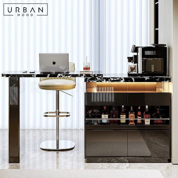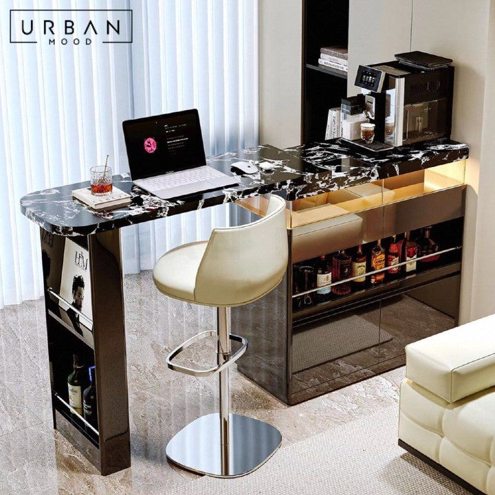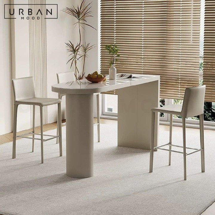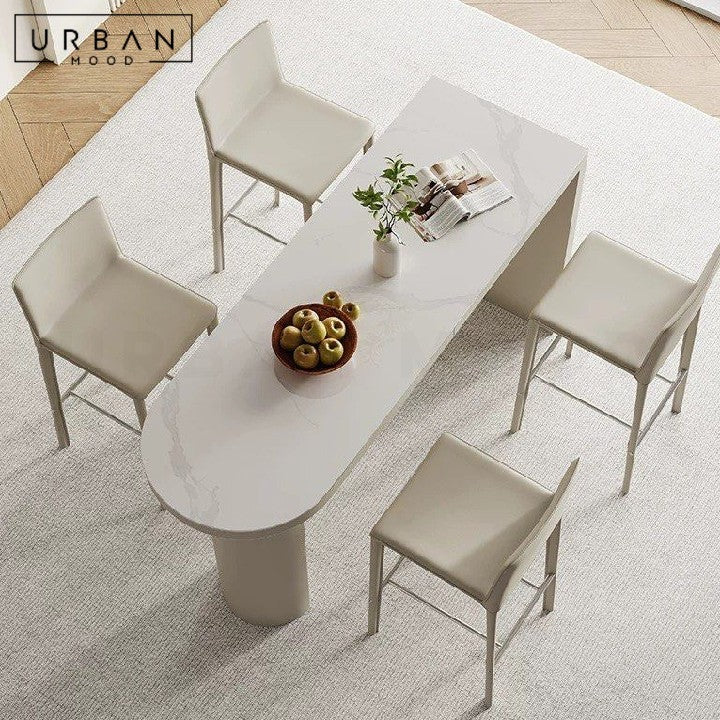 A beautifully unique design that redefines the bar or kitchen area, our ELA island table is crafted from sintered stone, solid ash wood, and saddle leather, offering a strong foundation while adding a touch of luxury. Complete the look with our HYPE leather bar chairs.