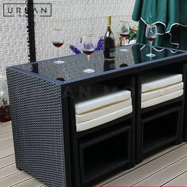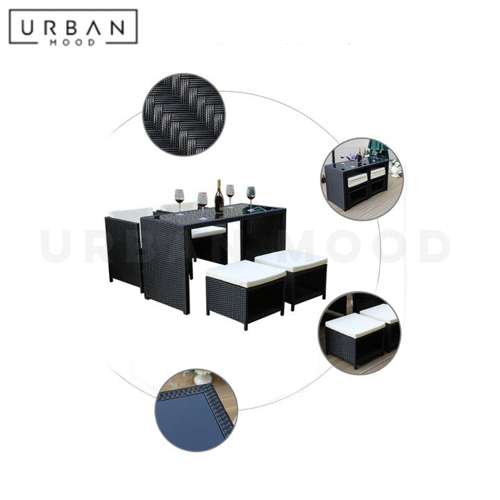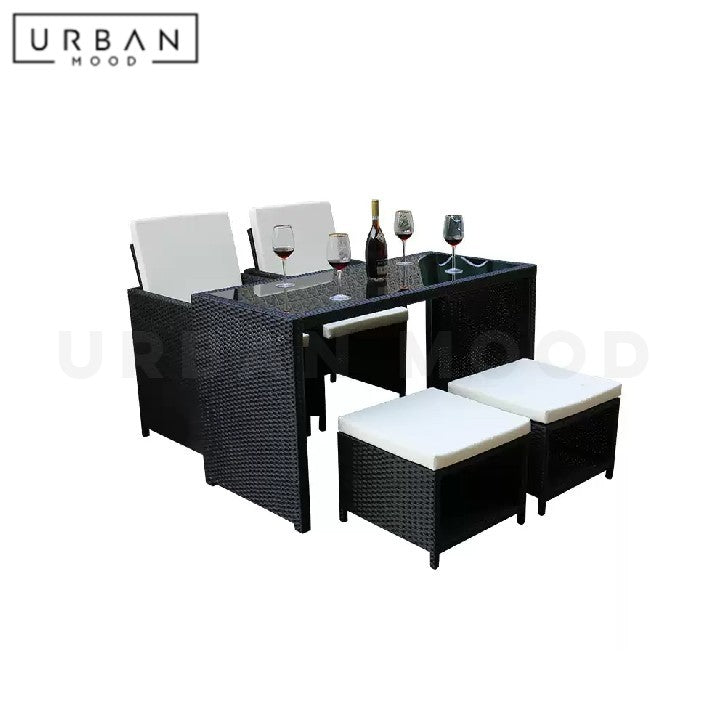 Crafted with durable woven rattan, the HARMSEN outdoor lounge set offers functionality and durability for patios, gardens, or balconies. Its clean, modern shape provides a comfortable seating arrangement paired with a sturdy table, making it ideal for outdoor dining or casual gatherings. Chairs tuck under fully when not in use, making this perfect for a compact HDB or condo balcony.