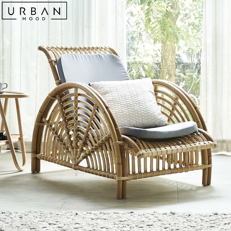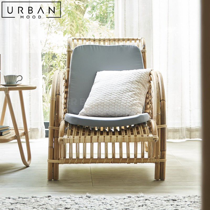 Enhance your living space with our STEV reading chair, designed to blend into any rustic, vintage, or barnhouse setting. Its unique wheel-shaped armrests crafted from natural rattan material provide a fresh take on retro styling, while its plush and padded seat provides comfort for long hours of reading or conversation. Its warm oak tones invite nature into any Wabi Sabi or Japandi living room, lounge room, or office lounge.