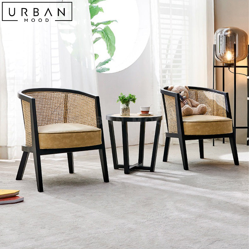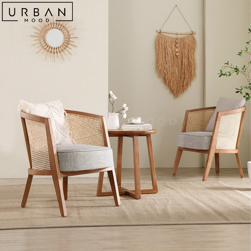 Elevate your living space with our AILEN modern rattan chair. This chic piece is constructed from organic rattan and brings a touch of old world charm to any dining room or office space. Its rounded backrest and padded seat provide utmost comfort for vintage, Japandi, or Wabi Sabi interiors. The rattan construction adds a natural appeal to your interior. Revamp your seating area and enjoy its blend of style and comfort.