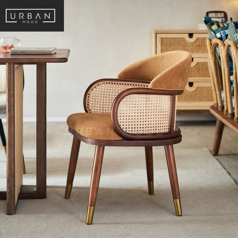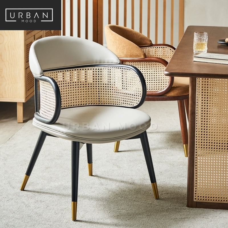 Crafted from the finest faux leather, rattan and solid wood, the CALDER dining chair is a designer piece inspired by mid-century and victorian styles. Equipped with a breathable backrest and plush armrests in faux leather, the chair provides high levels of comfort for long hours. A beautiful accent piece for your home office, showroom, lounge room, or dining area.