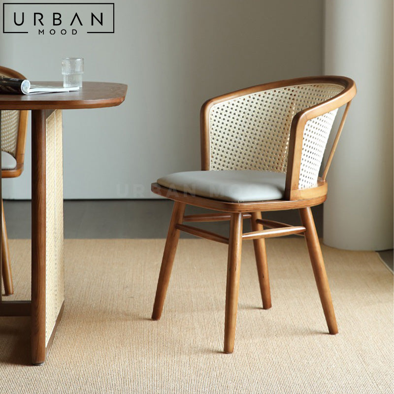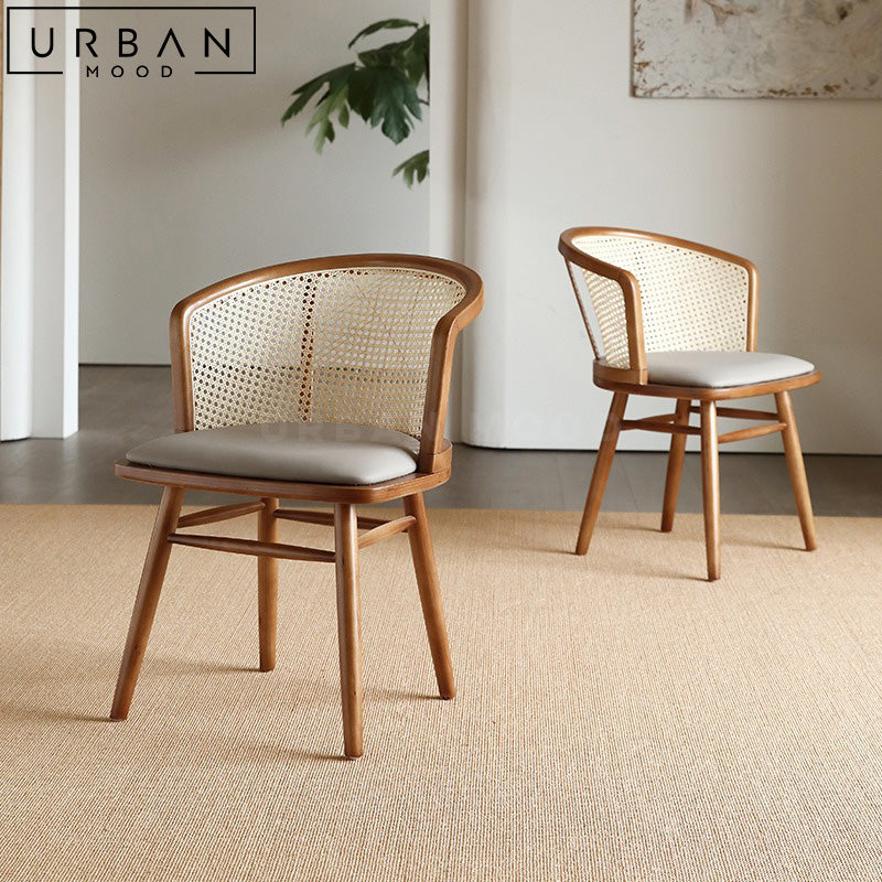 Crafted from pine wood in a dark walnut finish, our KALEB dining chair features a distinct rattan backrest that adds a touch of natural charm to any living space. This chair is perfect for creating a cozy atmosphere in your dining area or kitchen. The unique design makes it easy to style with a variety of other furniture pieces. The comfortable seating and sturdy construction make it a great choice for entertaining guests, as well as everyday use. With its timeless look, this rustic dining chair is sure to be an eye-catching addition to your home.