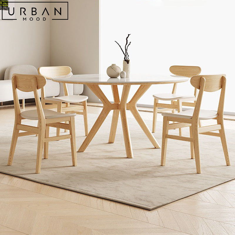 Enjoy meals, conversations, and gatherings around this chic and functional piece, adding a touch of modern sophistication to your home with our MRAM dining table. Featuring a round table top crafted from highly durable sintered stone and balanced upon an outstanding wooden leg in a light beech finish, this table is the perfect addition to any Scandinavian, Japandi, or farmhouse inspired homes. Its clean lines and elegant design make it a versatile choice that complements various interior styles. Whether you have a compact dining area or a spacious one, the MRAM dining table offers a stylish solution for your needs.