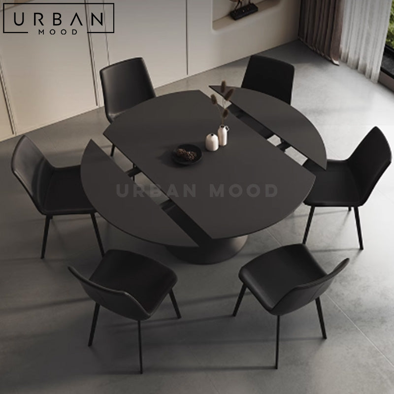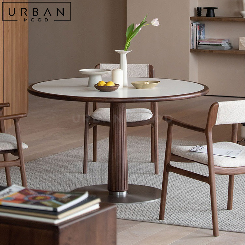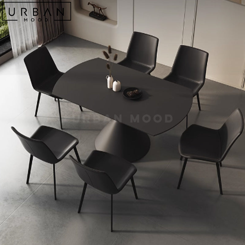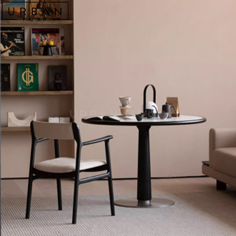 Our RYLAN dining table makes a statement of elegance and craftsmanship with its premium materials and attention to detail. This table boasts a sleek sintered stone top in a high gloss finish, showcasing the natural beauty of marble grains. Held up by a brass column that adds a mid-century flair, this dining table will complement modern, rustic, or industrial interior settings, making it an ideal choice for modern dining spaces. Complete the look with our matching chairs that tuck in seamlessly to the table, a thoughtful design for modern compact spaces.