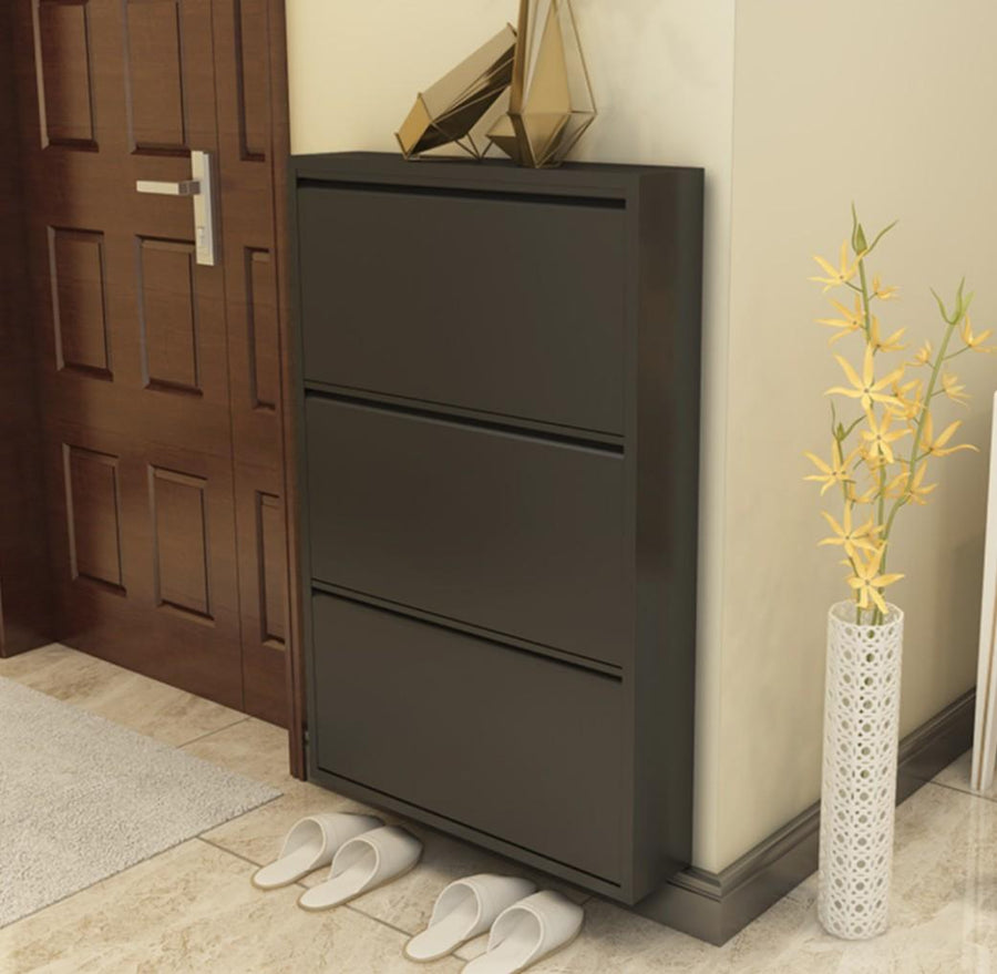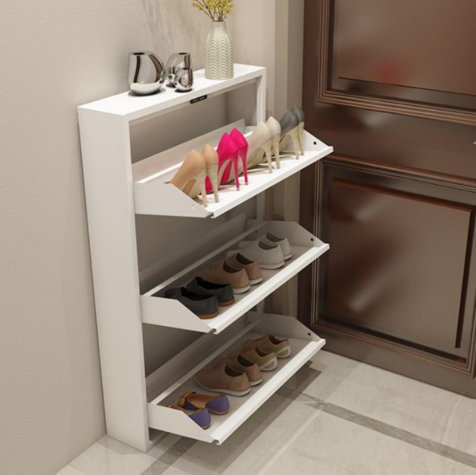 Gone are the days of flinging shoes out of the closet looking for the perfect pair and say goodbye to falling boxes. This sleek shoe cabinet is mounted to the wall and neatly stores your shoes behind 3 stylish closet doors. All 3 closet doors open at the same time with just one pull.