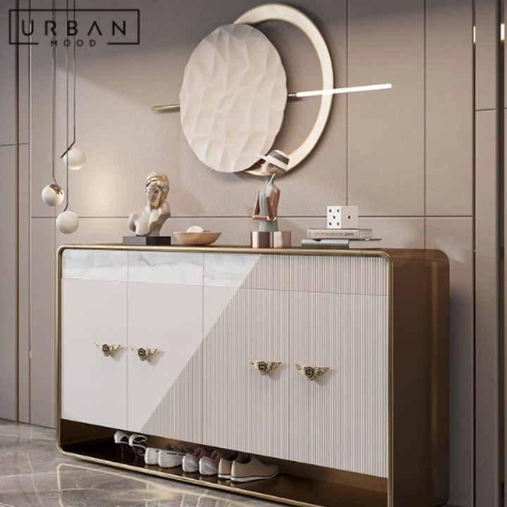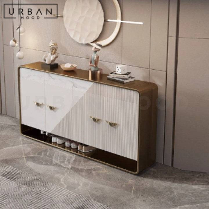 Our GUINNESS shoe cabinet showcases a thoughtful design with durable materials for everyday organization. Built with a solid oak wood frame and E1 handcrafted fluted boards, it offers a warm, textured look that complements contemporary interiors.