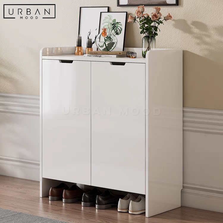 Keep your entryway clutter-free with our sleek MELVIN shoe cabinet. Crafted from laminated plywood with a luxurious glossy finish, its clean-lined silhouette complements any modern or minimalist decor. Multiple tiers of shelving provide ample space for your footwear collection, while a thoughtfully designed mantel adds a contemporary touch, perfect for displaying collectibles and accessories.