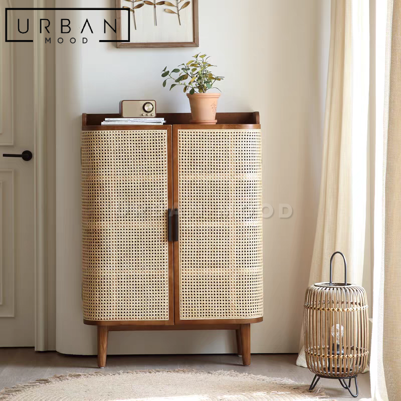 Handcrafted from the finest Indonesian rattan, our MORGAN shoe cabinet showcases an ash wood frame in a deep walnut stain. This stylish piece boasts curved rattan doors, adding a touch of softness to your space. Multiple tiers of shelving provide ample storage for your shoe collection. With its versatile design and functional layout, this shoe cabinet is a must-have for organizing your footwear in style. Bring a touch of sophistication to your rustic vintage or cottage-inspired entryway.