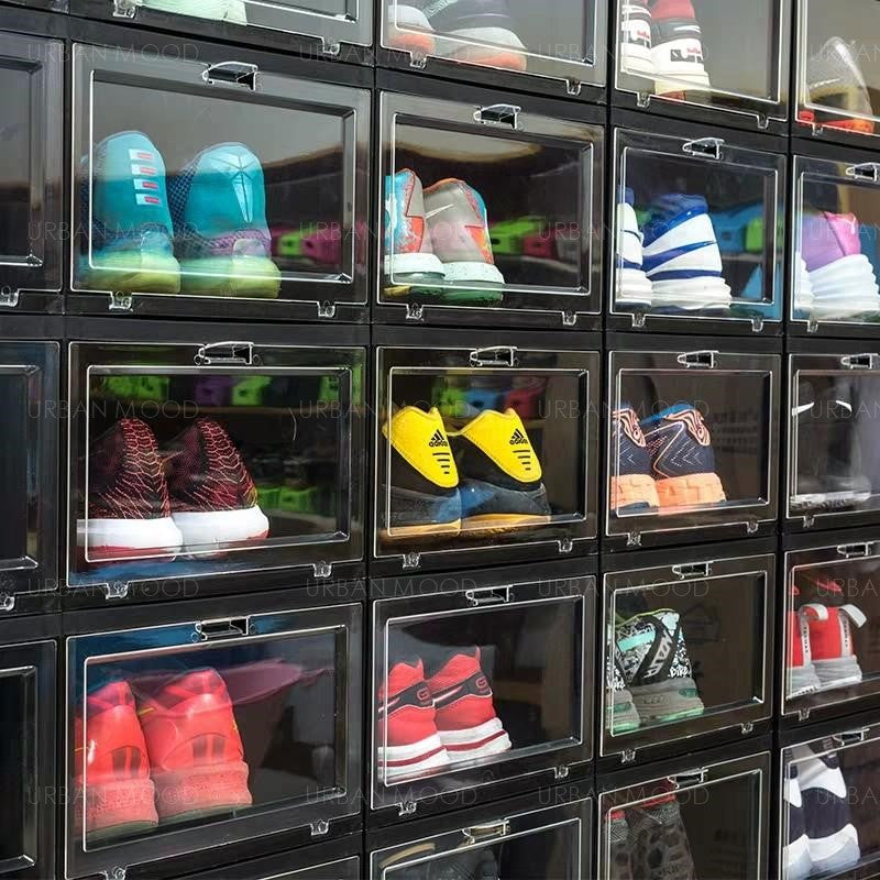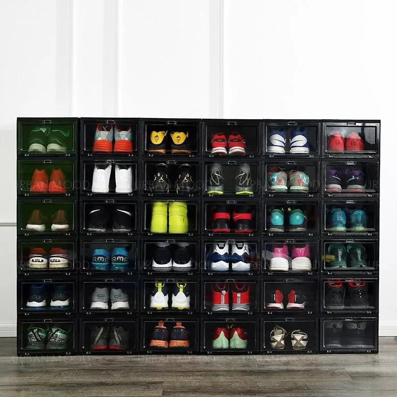 Both aesthetically pleasing and easy to assemble, you can transform the look of your shoe cabinet with a simple rearrangement of these stackable individual boxes. Made of acrylic and thick plastic, these storage boxes will not bend or break like the usual shoe boxes. Product from Korea.