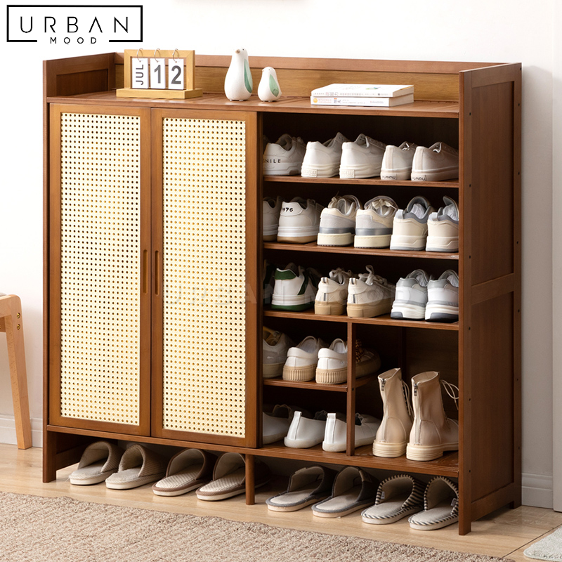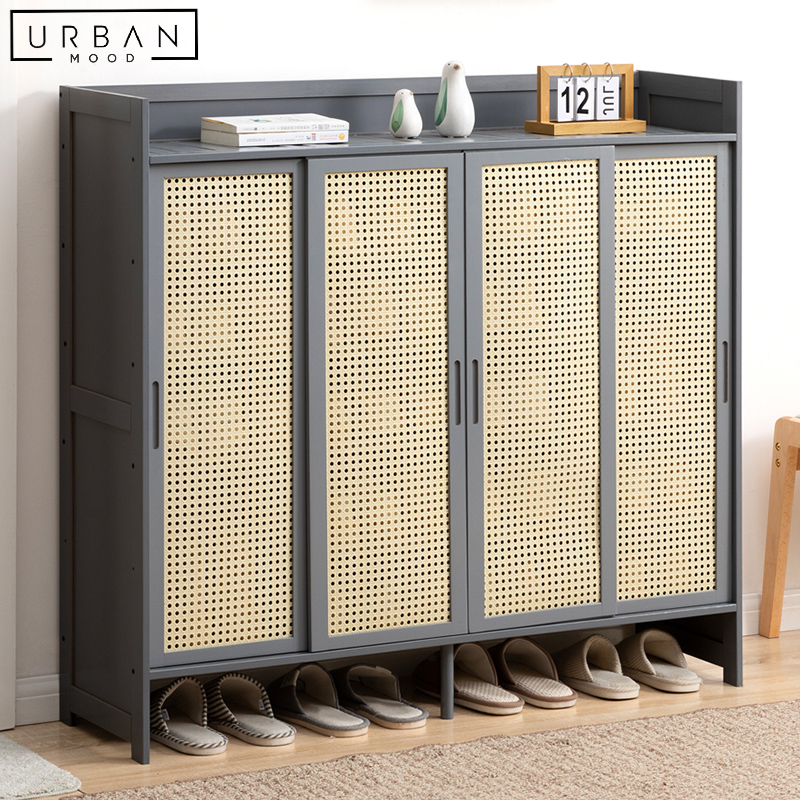 Constructed from high-density fiberboard, our RALPH shoe cabinet features beautiful synthetic rattan doors reminiscent of the good ol' 70s. Sliding doors reveal tiers of shelving for your shoes, and a recessed surface provides ample room for your display needs. Choose between 3 bold colours - modern grey, eclectic green and rustic brown to match your interior decor.